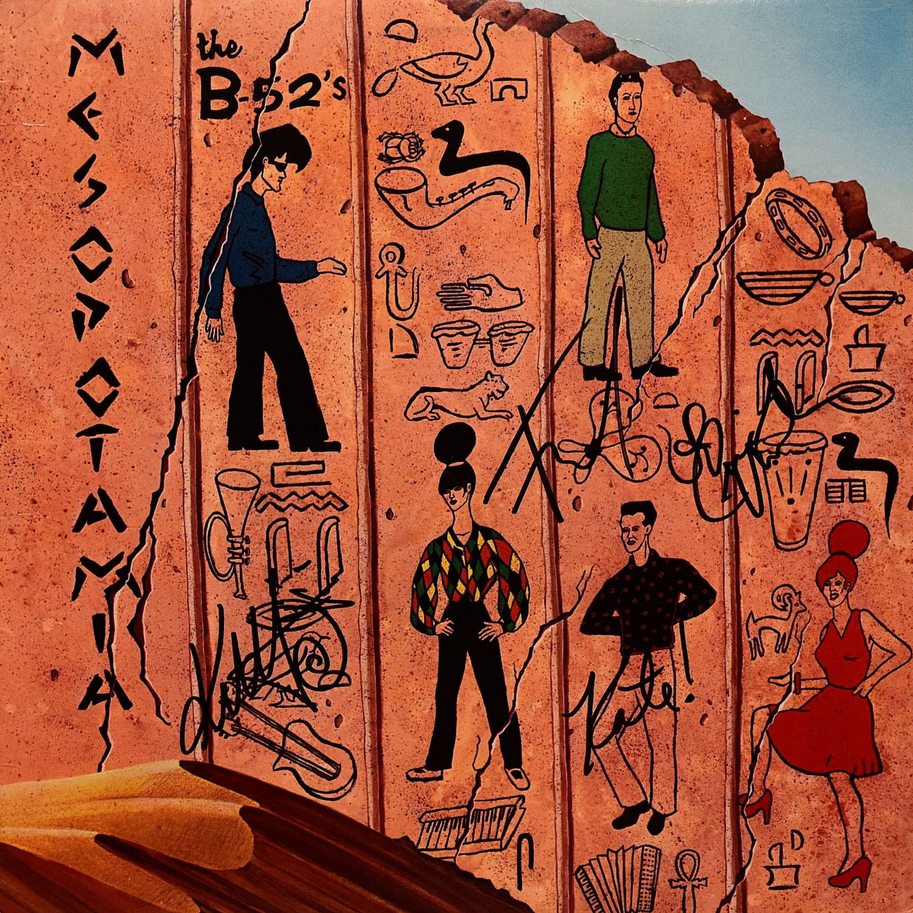 B-52's 1982 Mesopotamia album autographed by Kate!, Cindy Wilson, Keith Strickland, and Fred Schneider.