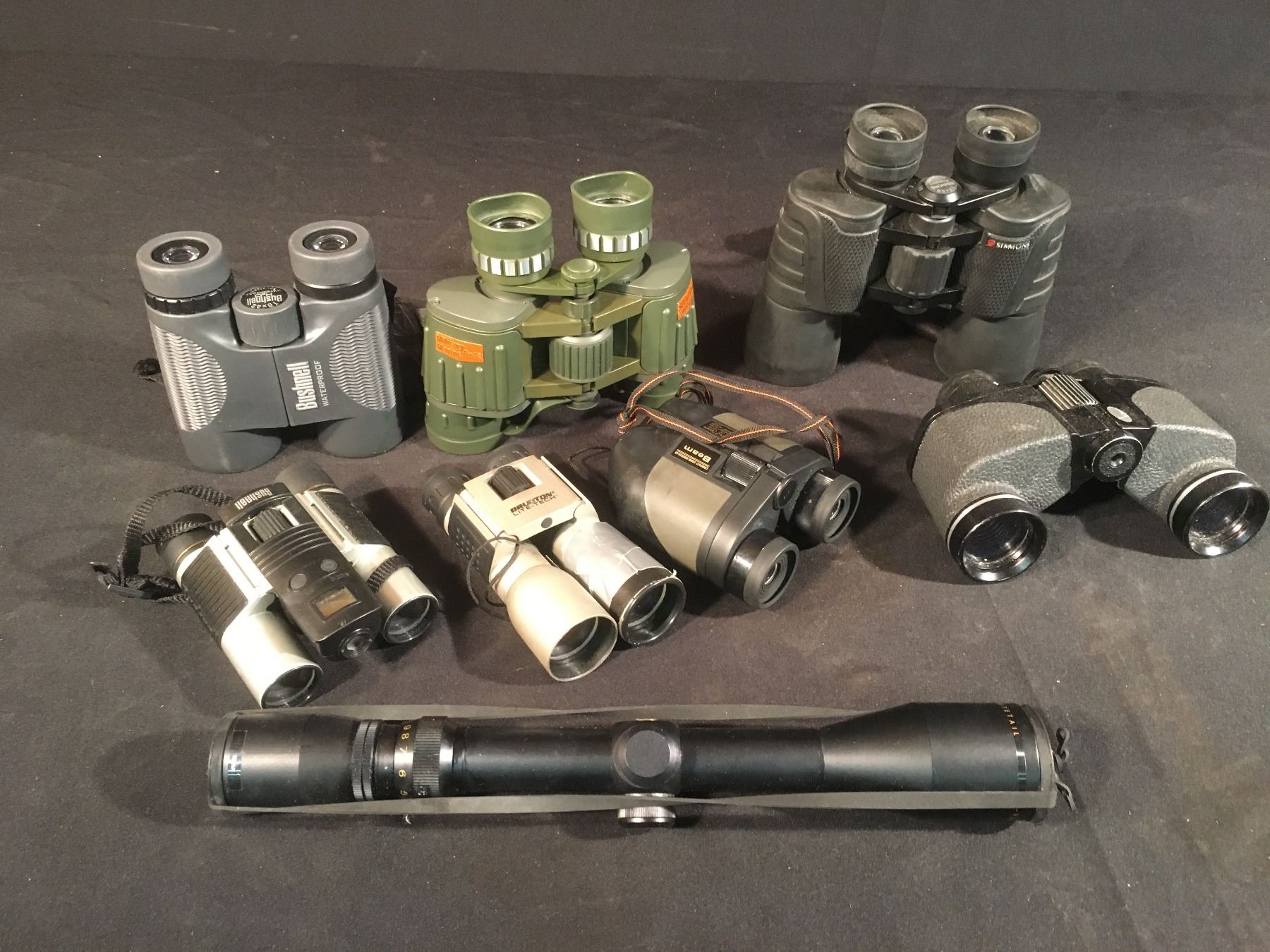 BAG OF ASSORTED BINOCULARS & SIMMONS 3-9X40 RIFLE SCOPE