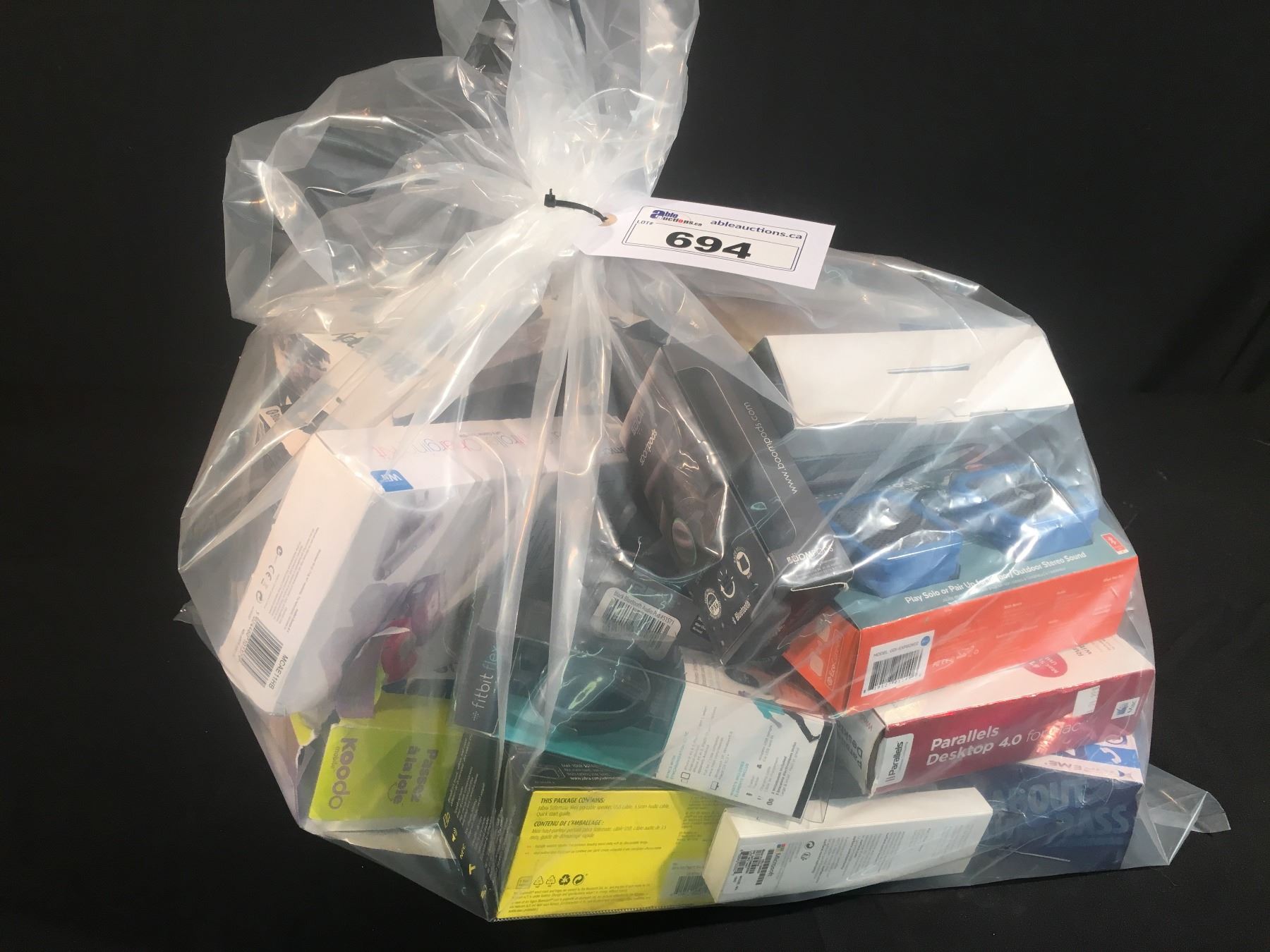 BAG OF ASSORTED BLUETOOTH SPEAKERS, FITBIT & HEADPHONES