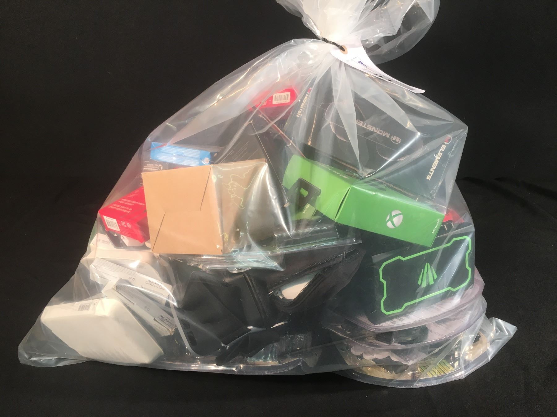 BAG OF ASSORTED ELECTRONICS: CHARGERS, HEADPHONES, VR GOGGLES & MORE
