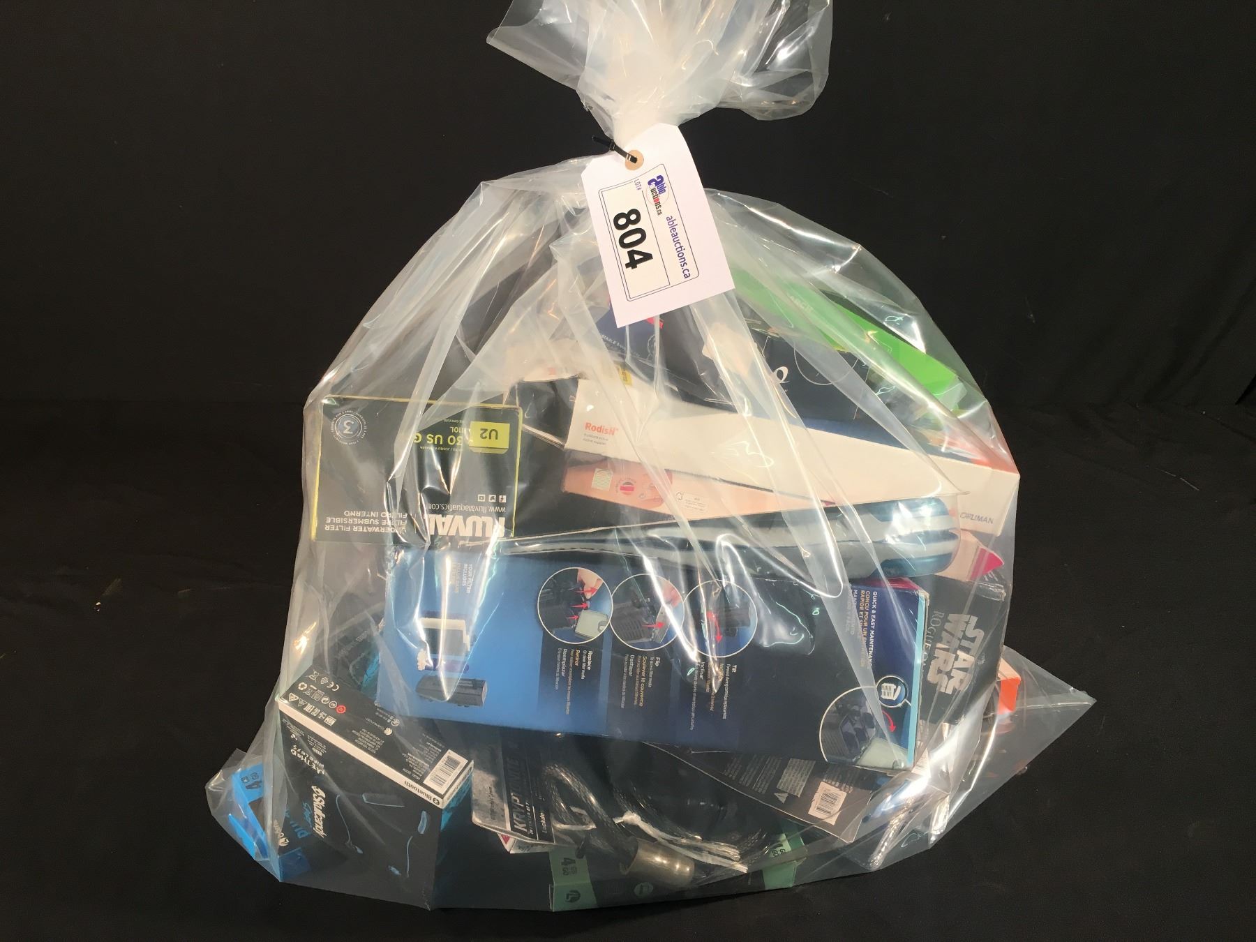 BAG OF ASSORTED HOUSEHOLD ITEMS: KNEE BRACES, FILTERS & MORE