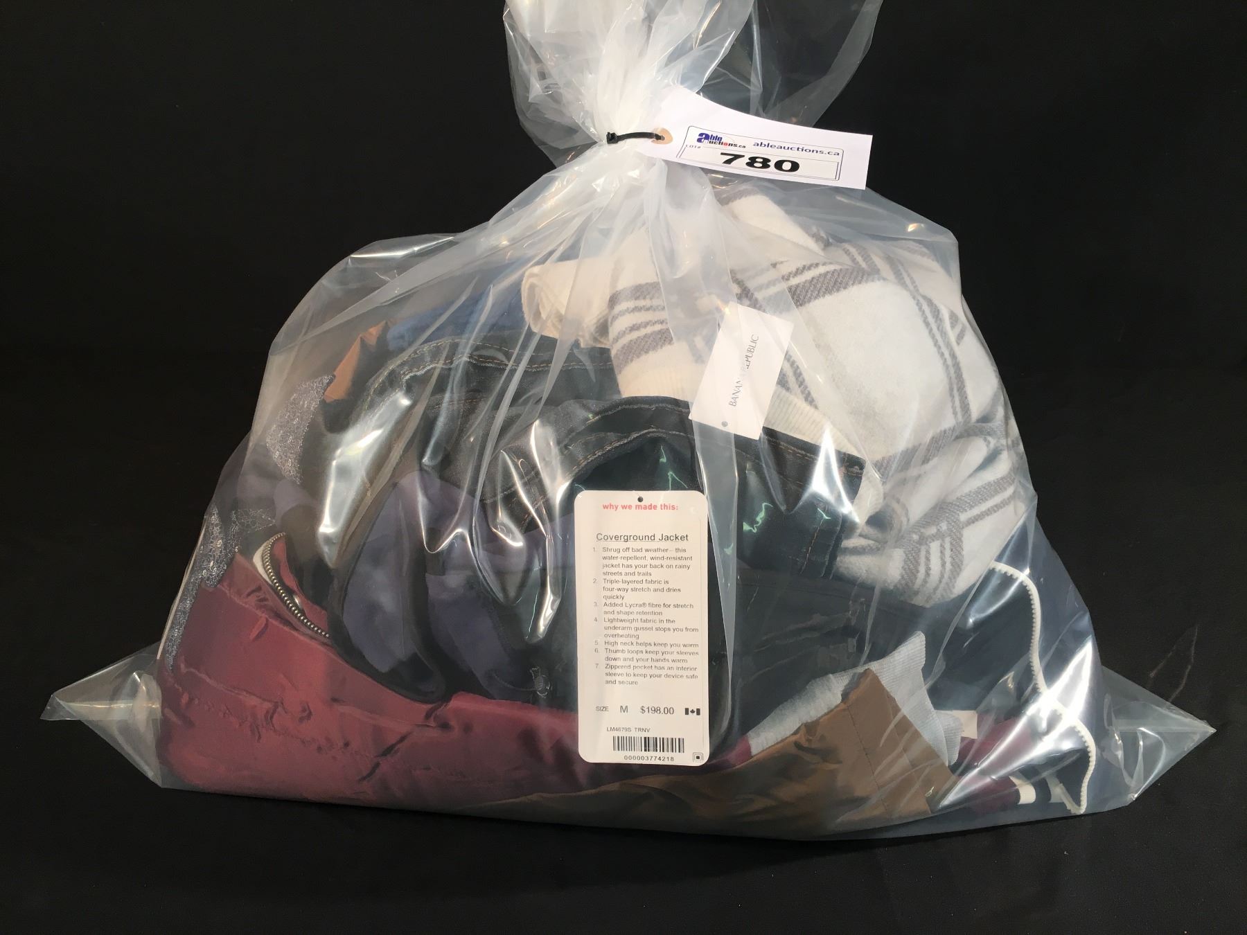 BAG OF ASSORTED MENS DESIGNER CLOTHING: PANTS, SWEATERS, JACKETS