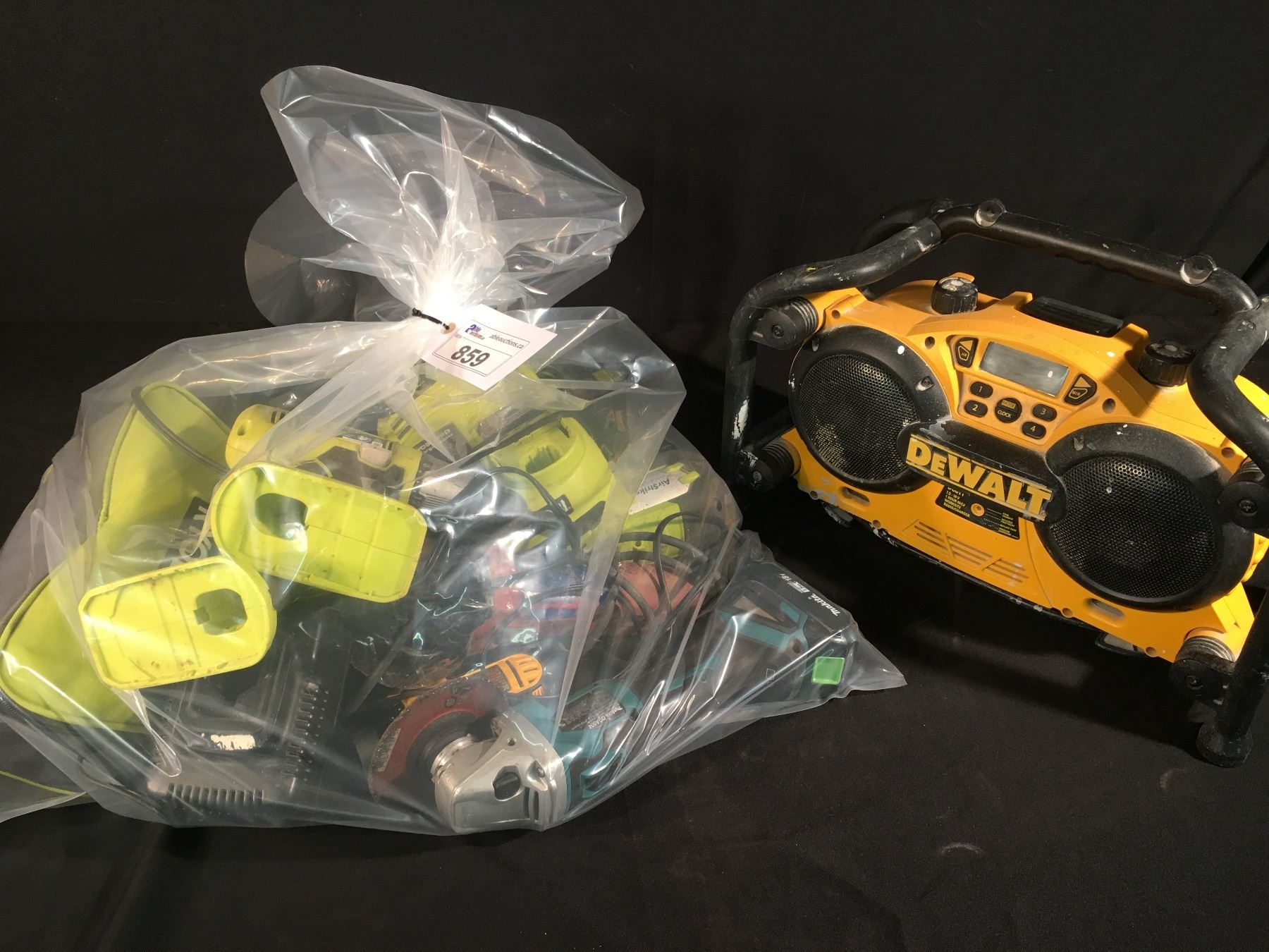 BAG OF ASSORTED POWER TOOLS & JOB SITE RADIO