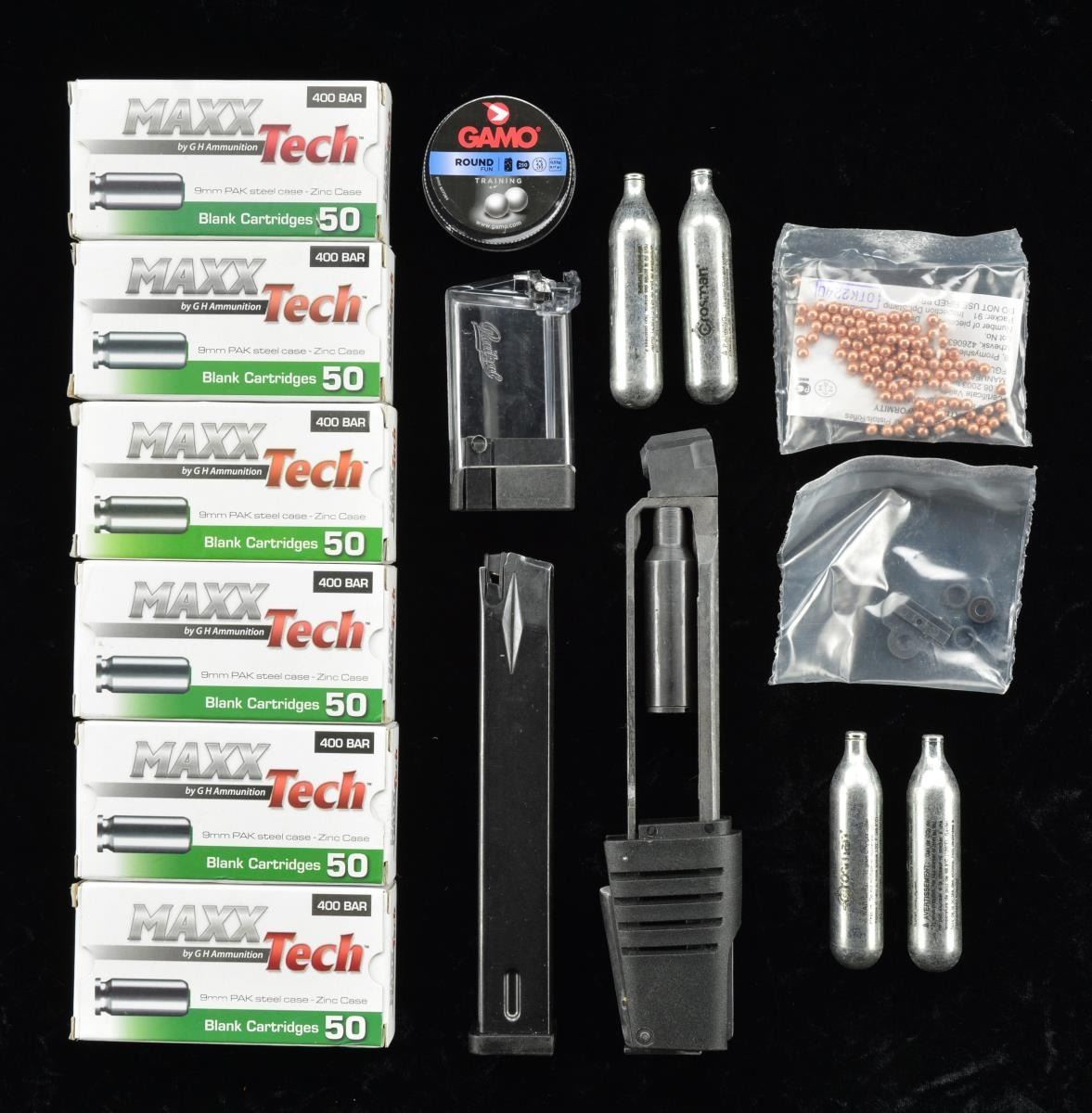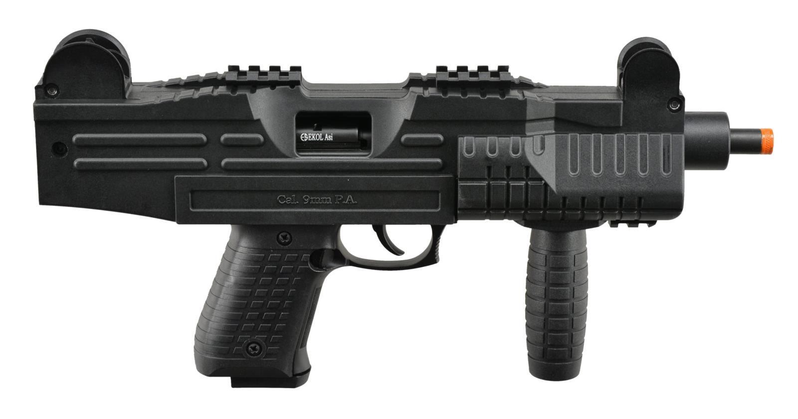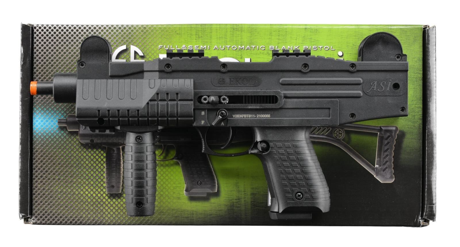 2) EKOL ASI FULL & SEMI BLANK PISTOL. Cal. 9mm BLANKS. S# V2IEKFBTS11-2100055. A steel frame having a black polymer exterior. Left side selector switch. Orange tip to gas port. fixed sights. Vertical grip. MAGS: 1-15 & 1-25. UNATTACHED ACCESSORIES: box, 300 rds. of Maxx Tech ammo & manuals. CONDITION: near excellent. (02-16764/MD). $250-500.