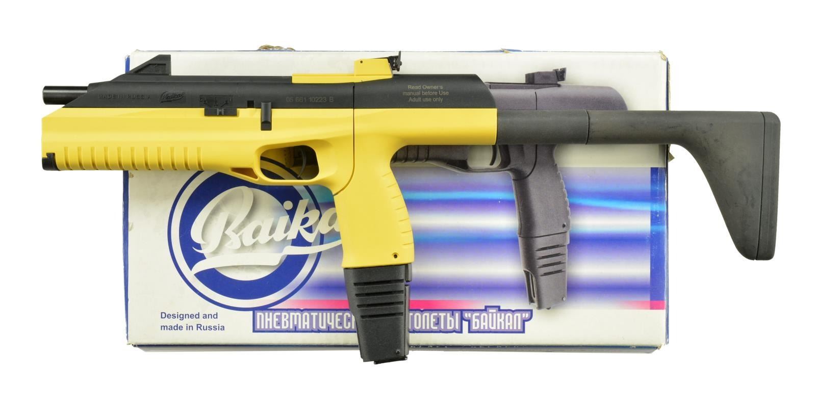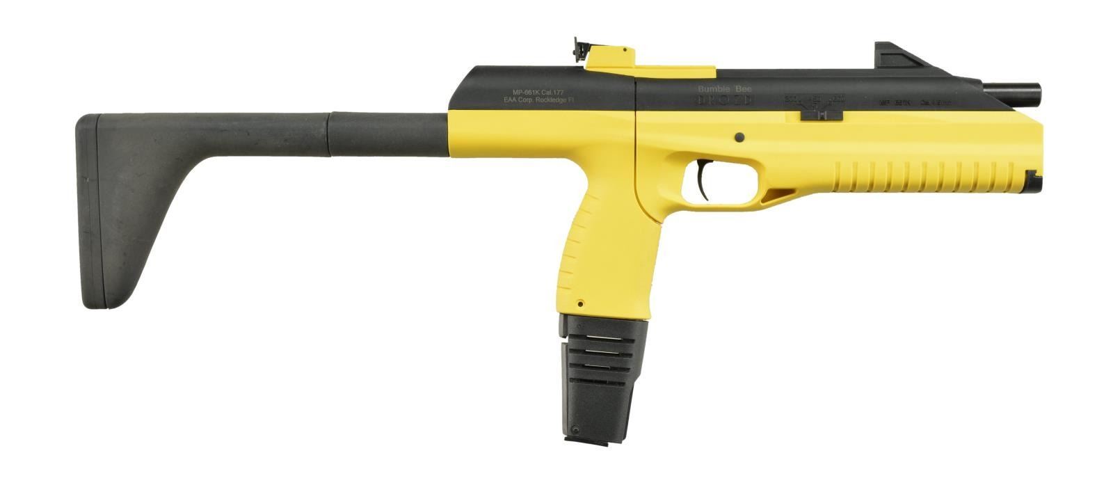 1) EAA / BAIKAL MP-661K BUMBLE BEE DROZD. Cal. 4.5mm/.177. S# 03 661 10223 B. Bbl. 9". Polymer chassis w/ distinct yellow color. Blade front & adj. rear sights. "1-3-6" selector. Power by AAA batteries. MAGS: 2 in wrapping. UNATTACHED ACCESSORIES: box w/ manual, mags, loading, buttstock, bags of .177 balls, 6 AAA batteries & 4 CO2 canisters. CONDITION: near excellent.