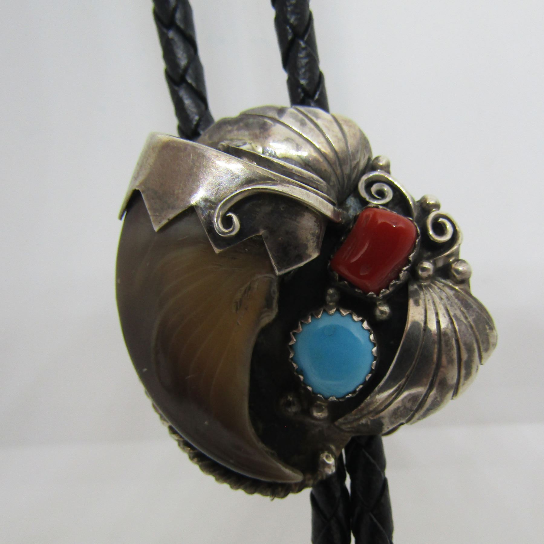 OLD PAWN UNMARKED TESTED STERLING SILVER. VINTAGE ESTATE SOUTHWEST NATIVE AMERICAN NAVAJO TRIBE JEWELRY. 38" LONG OVERALL WITH 1.75" TIPS AND PENDANT MEASURES 35MM X 35MM. WEIGH 23.1 GRAMS. GENUINE CLAW, RED CORALAND TURQUOISE. USA SHIPPING $8