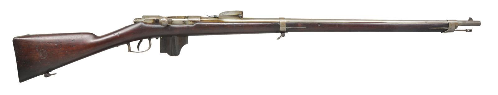 Cal. 11.35X51R. S# 976. Bbl. 32.7", left flat has 1875 date. Barleycorn front sight w/ military leaf rear sight. Bolt action w/ 4 rd. box magazine. 2 Band walnut stock. Right side of stock has circular mark "MAASTRICHT" w/ crown over "W" & 1876 date. CONDITION: metal has cleaned gray appearance. Stock has age darkened worn appearance showing dents & marks. Bore has slightly darkened appearance retaining strong rifling. (01-20695/DS). ANTIQUE. $300-500.