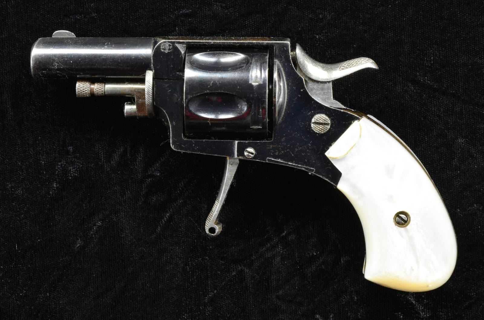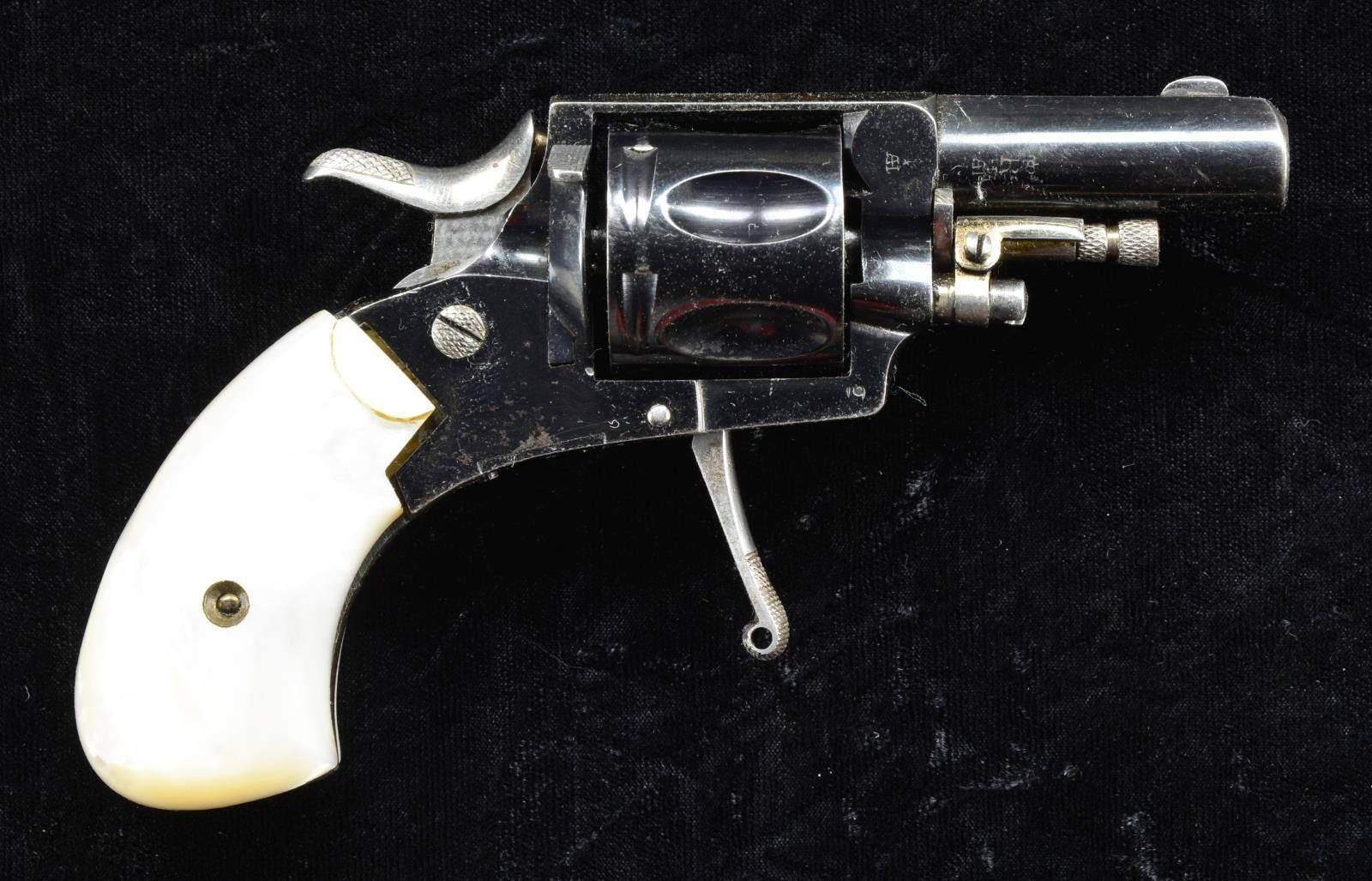 Cal. 320 Revolver. S# 101. Bbl. 2" w/ blade sight plus trough in top strap. Mfg. in Belgium w/ appropriate proofs. Cross bolt hammer safety. Pearl grips. CONDITION: very good overall appearance w/ some fading & high point finish loss. Near excellent bore & grips. PROVENANCE: Estate Collection of Kenneth Horn (Grandson of JC Higgins). (22-462/NW). CURIO. $200-350.
