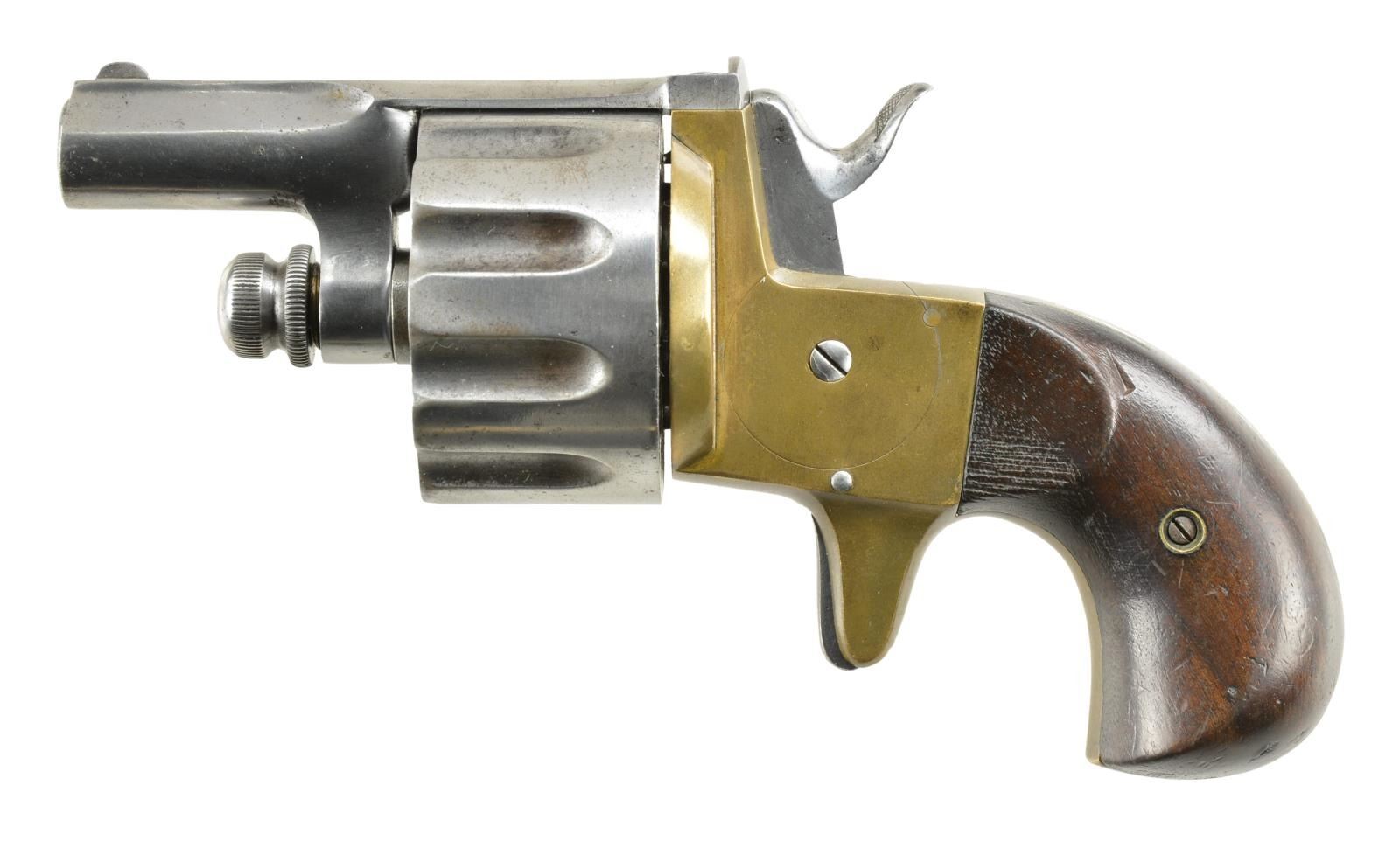 Cal. 44 Webley. S# 4. Bbl. 2" ribbed extending to rear of frame where attached by 2 screws; blade front sight & V notched rear. Early Leige proof w/out crown plus crown T on cyl. S# 4 on cyl. (front & rear), left rear of frame under grip, bottom of recoil shield, bbl., loading gate & both grip backs (pencil). Originally nickel plated brass frame but only traces left; mostly under grips. Cyl., bbl., hammer, loading gate (traces of Niter blue) & trigger are in the white. 455 Webley will chamber, but rim diameter is slightly too large; bore diameter measures about .447"; appears this will also chamber 44 Bull Dog. CONDITION: Very good patina finish on frame & similar finish on steel parts w/ signs of cleaned light oxidation. Good grips w/ light marks & patina. Near excellent bore & chambers. Fine mechanical functioning. PROVENANCE: Estate Collection of Kenneth Horn (Grandson of JC Higgins). 22-458/NW). CURIO. $500-1,000.