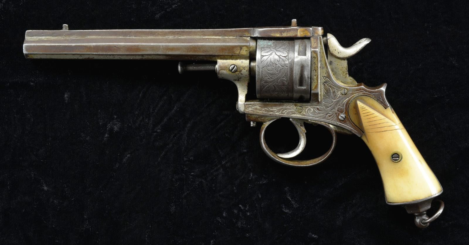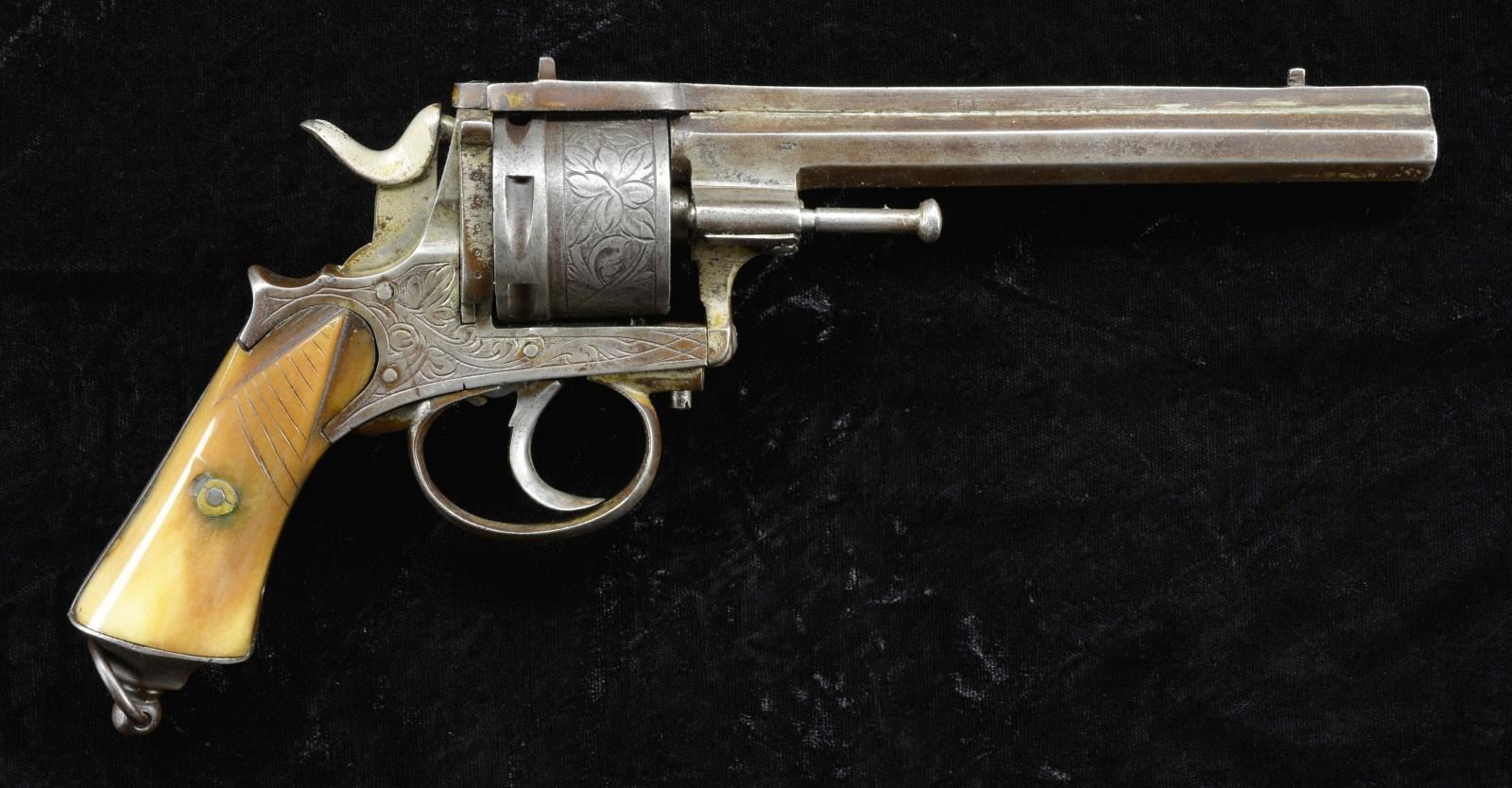Cal. 9mm CF. NSN. Oct. 5 7/8" bbl. Solder & screw attached rib has fixed sight. Adorned w/ vine type foliate scroll engraving that extends to 6 shot rnd. cyl. & rib. 2 Piece bone colored grips. Lanyard ring at butt. CONDITION: fair overall w/ metal turning dark gray patina w/ oxidation & pitting. Grips have deep several line scratches & a couple of chips. Good bore w/ pitting. PROVENANCE: Estate Collection of Kenneth Horn (Grandson of JC Higgins). (01-20659/MD). ANTIQUE. $300-400.