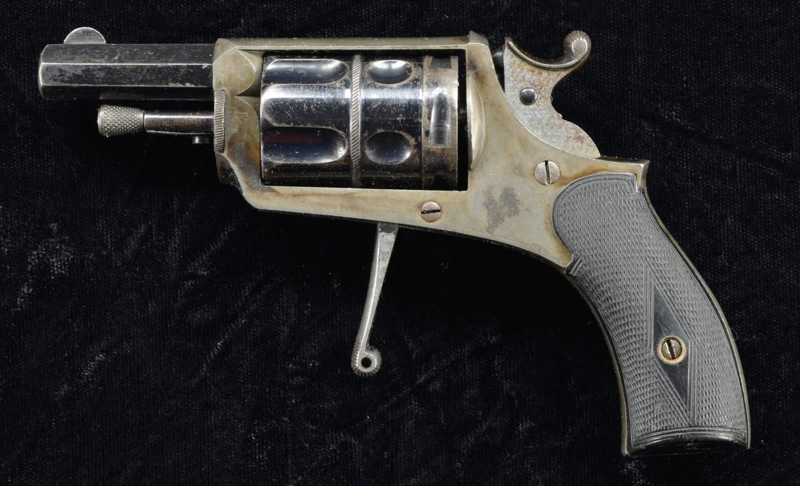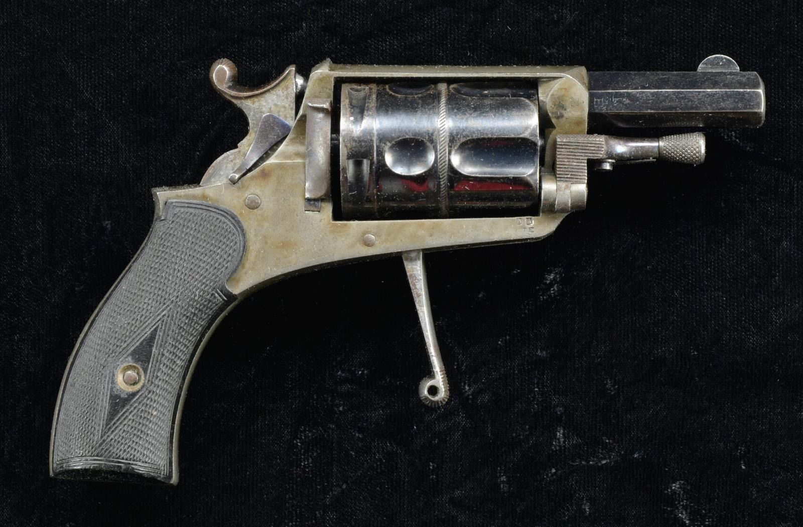Cal. 5.5 Velo Dog. S# NSN. Bbl. 1 5/8" oct. w/ half moon blade plus frame notched rear. Velo Dog cal. slightly larger in size than 22 Mag plus it's centerfire. Safety on hammer operates to disengage hammer allowing cyl. to rotate when trigger is pulled. Back of each finely checkered dark walnut grip plus frame stamped w/ "L". CONDITION: very good overall w/ some light high point wear & faded case colored frame. Near excellent bore, grips & functioning. PROVENANCE: Estate Collection of Kenneth Horn (Grandson of JC Higgins). (22-440/NW). CURIO. $150-250.