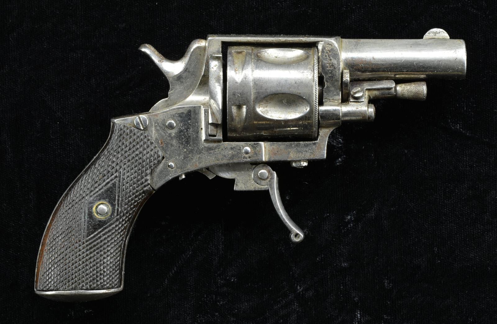 Cal. 7.65mm CF. S# 211. Bbl. 1 7/8" w/ half moon front sight. Nickel finished w/ 5 shot fluted cyl. 2 Piece hard rubber grips. CONDITION: good overall w/ flaking finish, oxidation & handling marks. Good bore w/ light pitting. (01-20760/MD). ANTIQUE. $100-200.