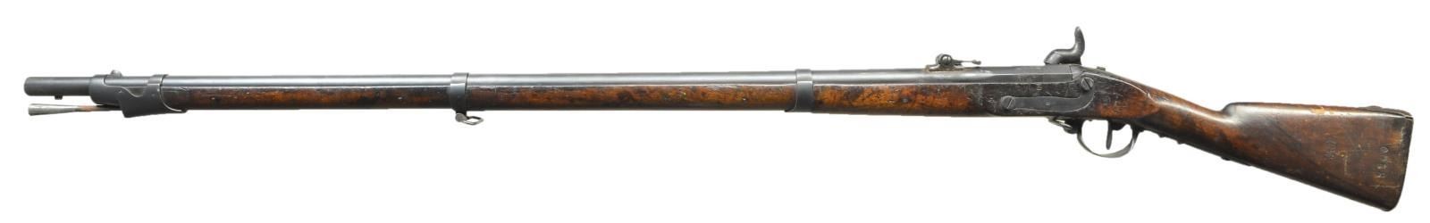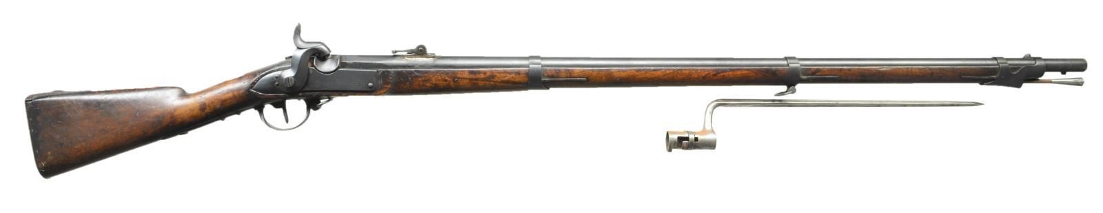 Cal. 71. NSN. Bbl. 42 1/2" rnd. w/ oct. shank & rifled bore. Blade front sight w/ graduated rotating bar rear sight. Left flat has a Belgian "ELG" in oval proof mark w/ "S" marking on upper left flat & cross in circle marking on top flat. Unmarked lock. 3 Band fastened walnut stock w/ iron fittings. Left side of stock is stamped "VAUD / 8200". Left ear of stock is stamped w/ number 1772. Side plate has circular proof mark. UNATTACHED ACCESSORIES: socket type triangular type bayonet. Bayonet is cleaned bright showing scattered areas of red surface corrosion on socket. CONDITION: bbl., lock & fittings have acquired a dark patina appearance. Rear sight shows evidence of resoldering. Stock has age darkened worn appearance w/ numerous dents & handling marks. Area above lock shows wood erosion w/ plastic wood filler. Sound lock. Bore has dark, lightly frosted appearance & retains sound rifling. PROVENANCE: Estate Collection of Jack Verret Sr. (01-20706/DS). ANTIQUE. $500-750.