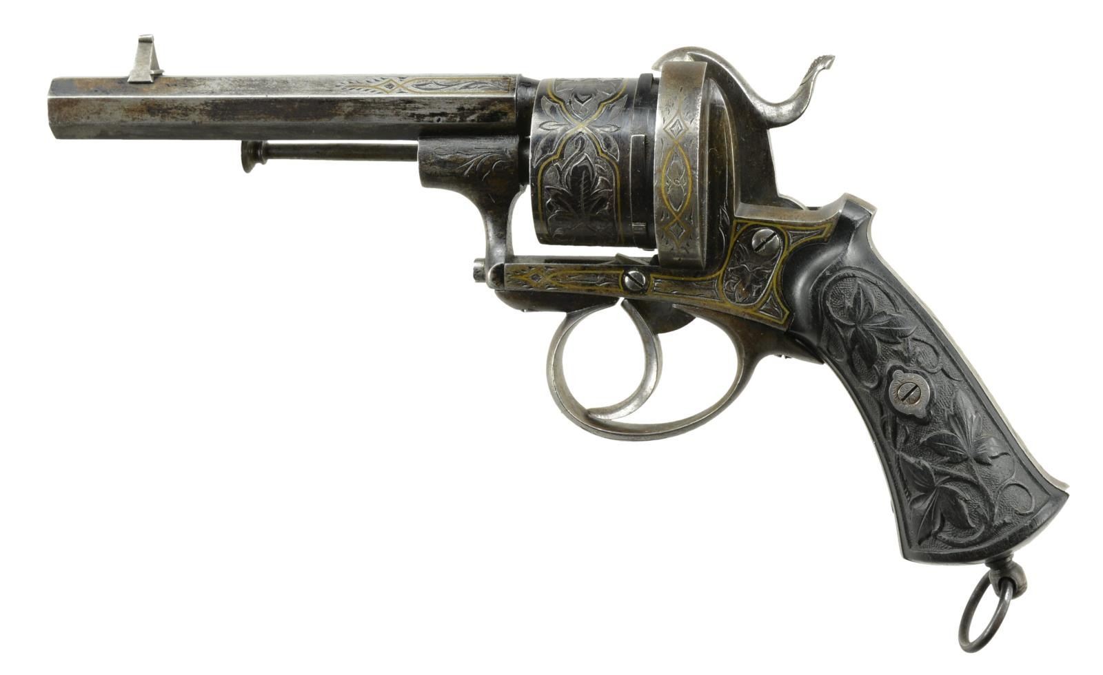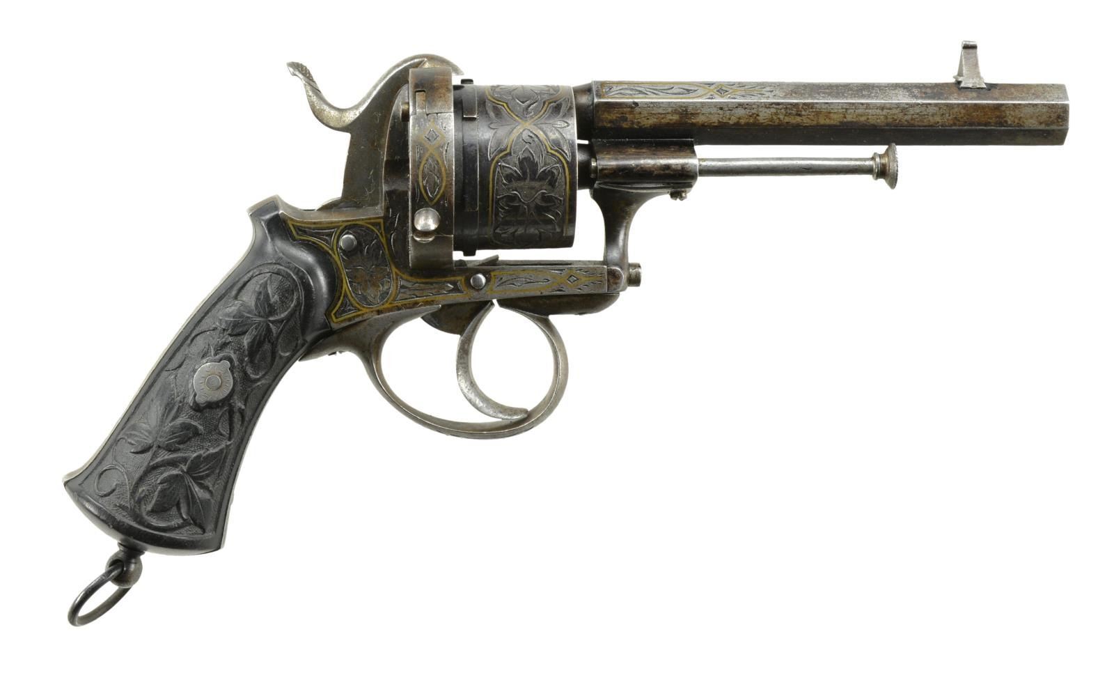 Cal. 38 Pinfire. NSN. Oct. 4 1/2" bbl. w/ tall bead front sight. Revolver is adorned w/ floral engraving having punch dot backgrounds & gold lines that extend to 6 shot cyl., trigger guard bow, back strap & breech end of bbl. 2 piece floral motif hard rubber grips. Lanyard ring at butt. CONDITION: Good overall. Bbl. & frame have worn finish to gray patina w/ light pitting. Good cyl. blue. Good grips w/ marks. Good plus bore w/ strong lands & light pitting. PROVENANCE: Estate Collection of Kenneth Horn (Grandson of JC Higgins). (01-20655/MD). ANTIQUE. $300-500.