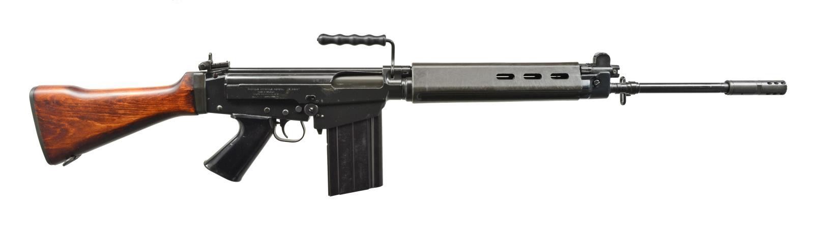 Cal. 308. S# 2505307. Bbl. 22.5" over 3.25" flash hider. Early, original Fabrique Nationale Herstal FN FAL. This is 1 of the more desirable examples of this rifle that has been referred to as “the right arm of the free world”. Traditional black painted finish on exposed metal surfaces. Wood buttstock. Plastic pistol grip, as well as forend. Protected post front sight along w/ rear peep sight adj. in elevation from 200m to 600m. Upper receiver left side stamped “308 MATCH”. Right side markings include: “Fabique Nationale Herstal / Made in Belgium / Steyr Secaucus NJ / Gunsouth Birmingham AL”. S# also resides on right side. This extremely popular & effective rifle has a carry handle, adj. gas system, as well as sling swivels front & rear. Utilizes metric style mags. MAGS: 1-20 rd. UNATTACHED ACCESSORIES: original plastic buttstock & recoil pad. CONDITION: metal overall 90% plus. Finish coverage on exposed metal surfaces are complete & consistent, the only obvious wear is behind as well as below ejection port, which is typical of this design. Wooden buttstock is attractive reddish stain w/ few normal impressions sitting a little proud of buttplate. Pistol grip, which is complete w/ cleaning device, has typical handling scratches. Forend is free of any apparent blemishing, aside from light scratching toward the rear, which would coincide w/ bipod leg placement at some point. Shiny bore w/ strong rifling. Fire control mechanism appears to function correctly when cycled by hand. (20-1590/JZ). MODERN. $1,500-2,500.