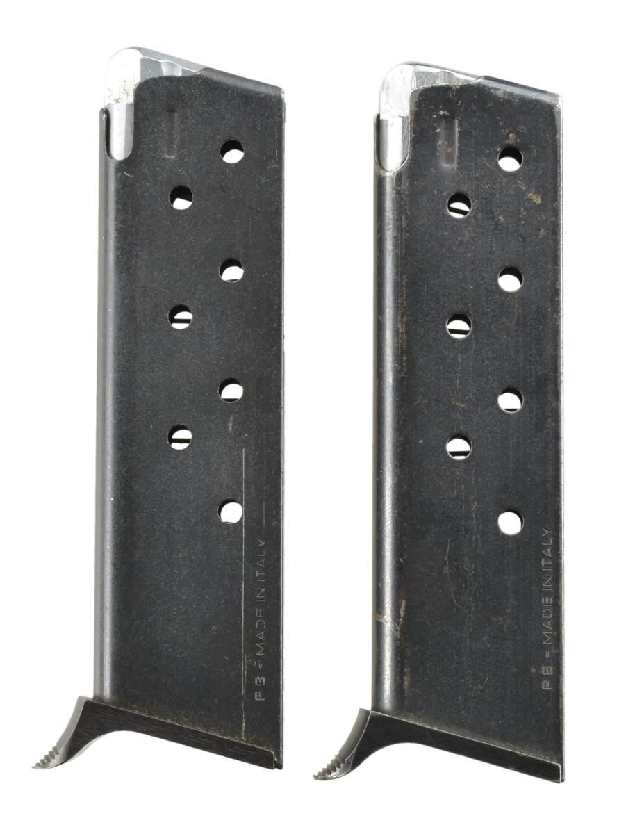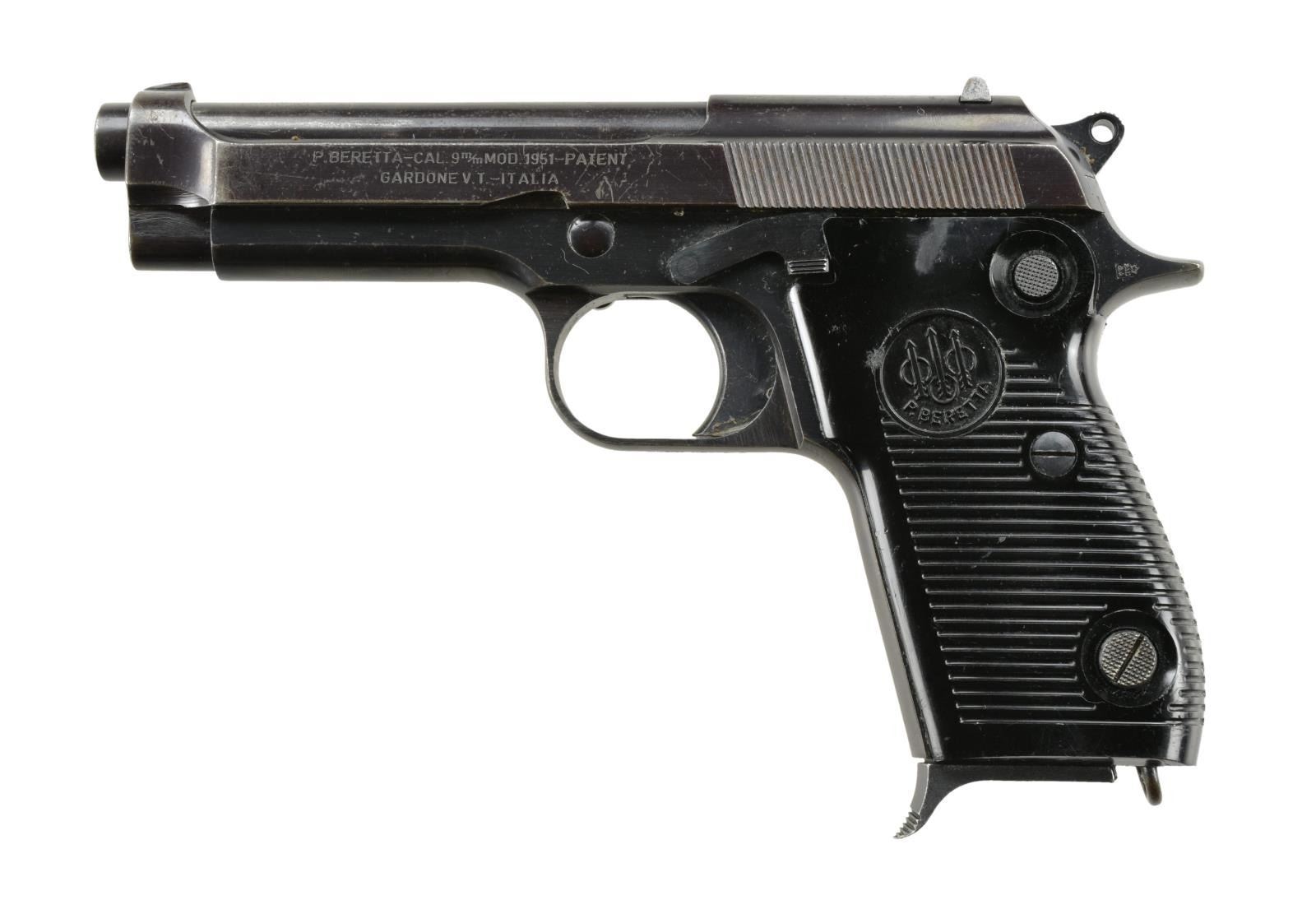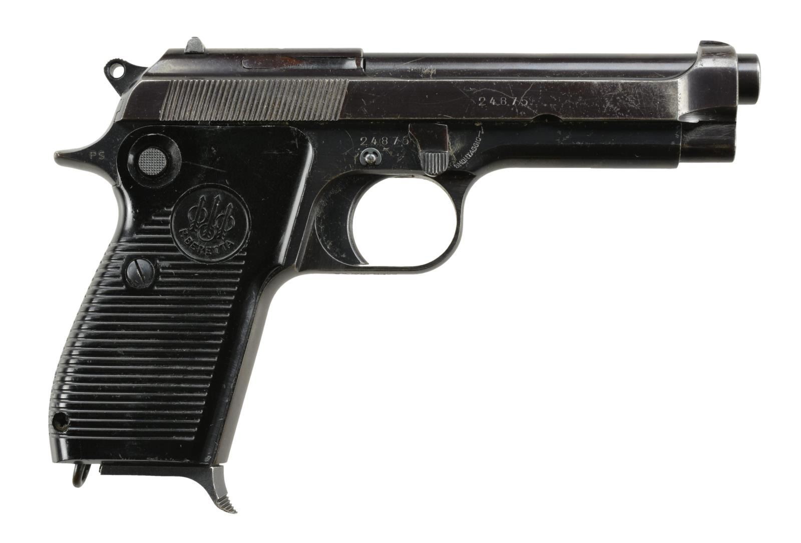 Cal. 9mm. S# 24875. Bbl. 4.5". An early and immediate predecessor to the M92 Series pistol. The outward appearance is very similar to the M92 aside from a few differences. Rear serrated slide hosting fixed iron sights. Serrated hammer spur. Left side controls. Mag. release located on left side on lower grip portion directly above lanyard loop. Single action design w/ single stack mag. Blued finish w/ black ribbed plastic grips. Bottom of trigger guard marked "FW ARMS / REDMOND, WA". MAGS: 3 steel 8 rd. UNATTACHED ACCESSORIES: an Ace #45 gun rug. CONDITION: original blue finish is complete & consistent w/ thinning on high spots in areas of mechanical intervention, scattered scratches & a gentle patina under control primarily on slide & bbl. Grips illustrate age well w/ a few rub marks typically associated w/ holstering. Bright bore w/ sharp rifling. Fire control mechanism appears to function correctly when cycled by hand. (22-764/JZ). CURIO. $300-450.