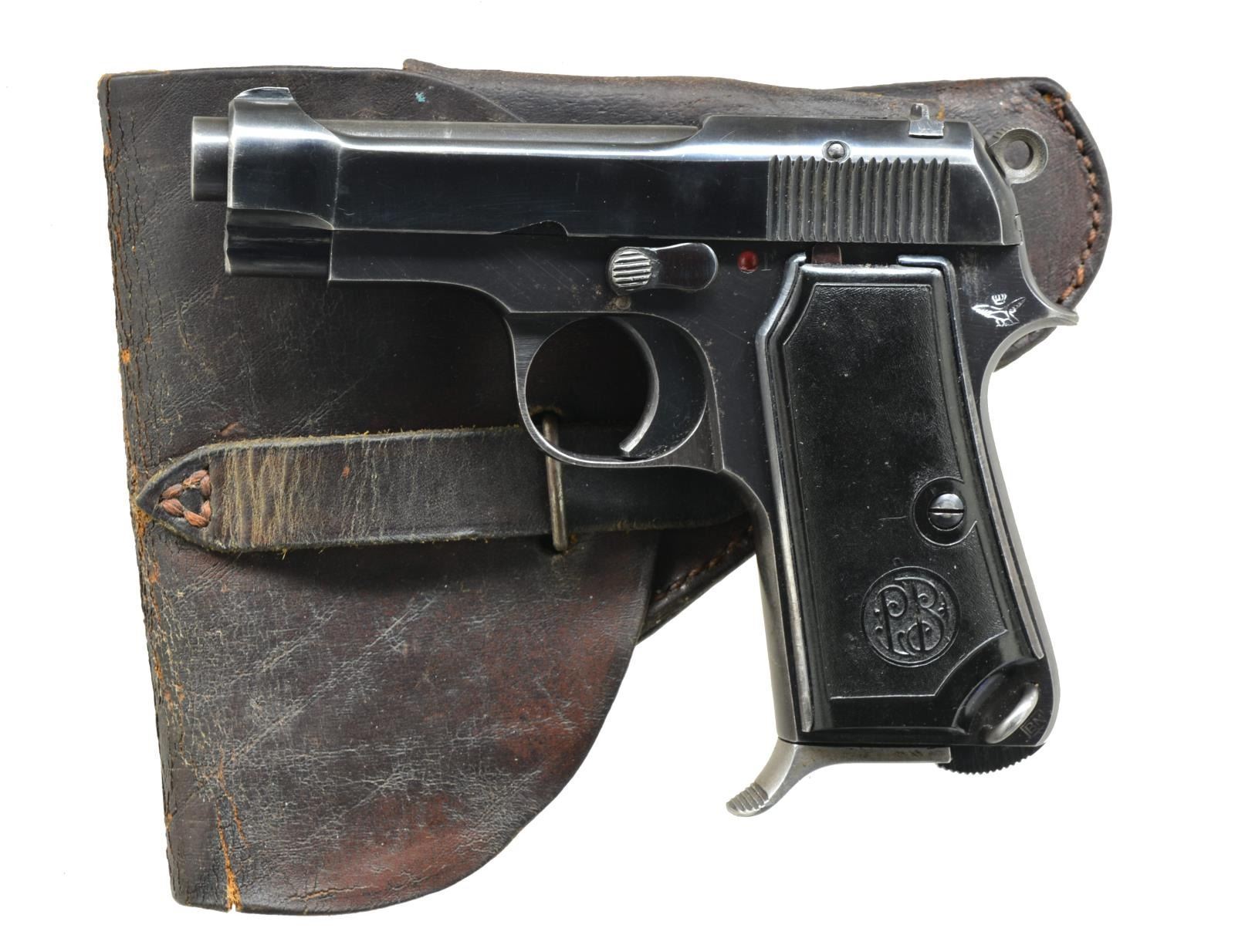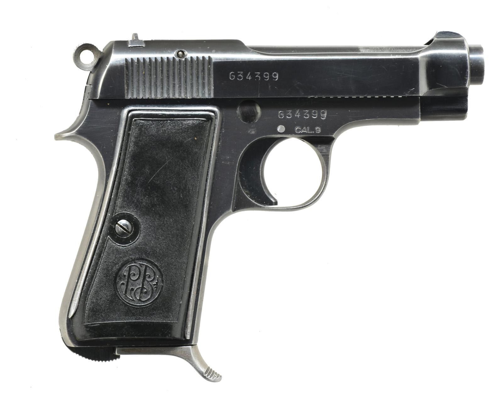 Cal. 9mm Corto (380 ACP). S# G34399. Bbl. 3 3/8". Mfg. for Italian Air Force w/ slide unmarked except for matching S# (matching numbered bbl.); air force symbol at top left rear of frame. Metal backed "PB" logo black plastic grips; lanyard loop at bottom left rear along w/ boxed "BM". Right side of trigger guard w/ boxed "PL" & in front of trigger pivot "CAL.9". MAGS: 2 finger extension 7 rd. TOTAL; 1) good unmarked w/ noticeable spine, front & floorplate wear; 2) good plus condition w/ minimal wear plus back marked in sm. font "DEinITALY" & in larger font "Cal. 9 Corto P.B.". UNATTACHED ACCESSORIES: fair well worn oiled leather holster w/ single wide belt loop & spare mag. pouch on front having almost broken through bottom. Staple & strap retention w/ leather backing of staple almost completely detached. Noticeable cracking at top of flap. No visible markings. CONDITION: very good general appearance w/ light function & high point wear plus thinning on front strap. Very good grips w/ thinning finish on backers; good to very good bore w/ faint cleaned pitting. (20-3269/NW). CURIO. $500-750.