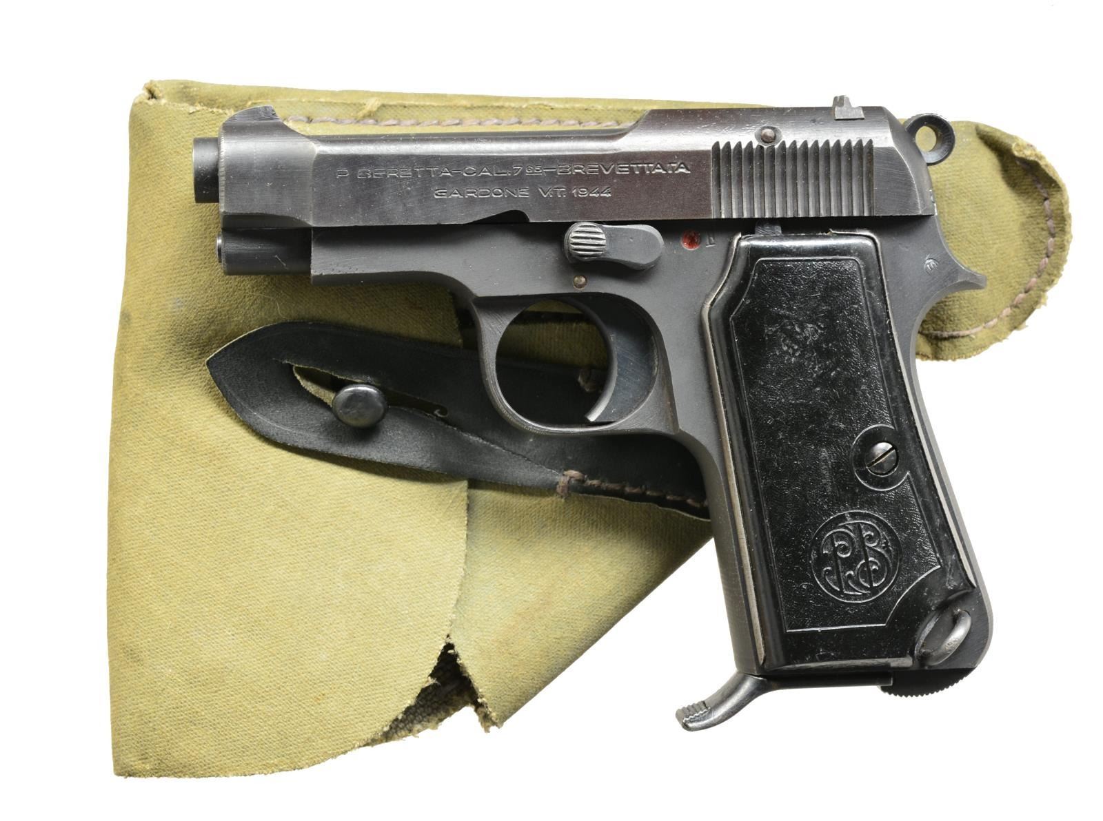 Cal. 7.65mm (32 ACP). S# 567596. Bbls. 3 3/8". Mfg. 1944-1945 as Group IV contract w/in S# 534,000-599,000 having half of "4UT" control stamp visible at top left rear of frame. Wartime matte finish w/ metal backed "PB" logo black plastic grips. All black parkerized finish w/ lanyard loop at bottom left rear of frame. Matching numbered slide & bbl. MAGS: 2 - 8 rd. TOTAL; very good original w/ finger extension & near excellent unmarked modern aftermarket. UNATTACHED ACCESSORIES: very simple green toned canvas double flap holster w/ mag. pouch on front. Black wide leather belt loop & corresponding strap on front plus stud on top flap. CONDITION: faint wear on top of bbl. from slide plus sm. spot on top of beavertail extension; all other aspects near excellent including bore & grips. (20-3333/NW). CURIO. $550-800.