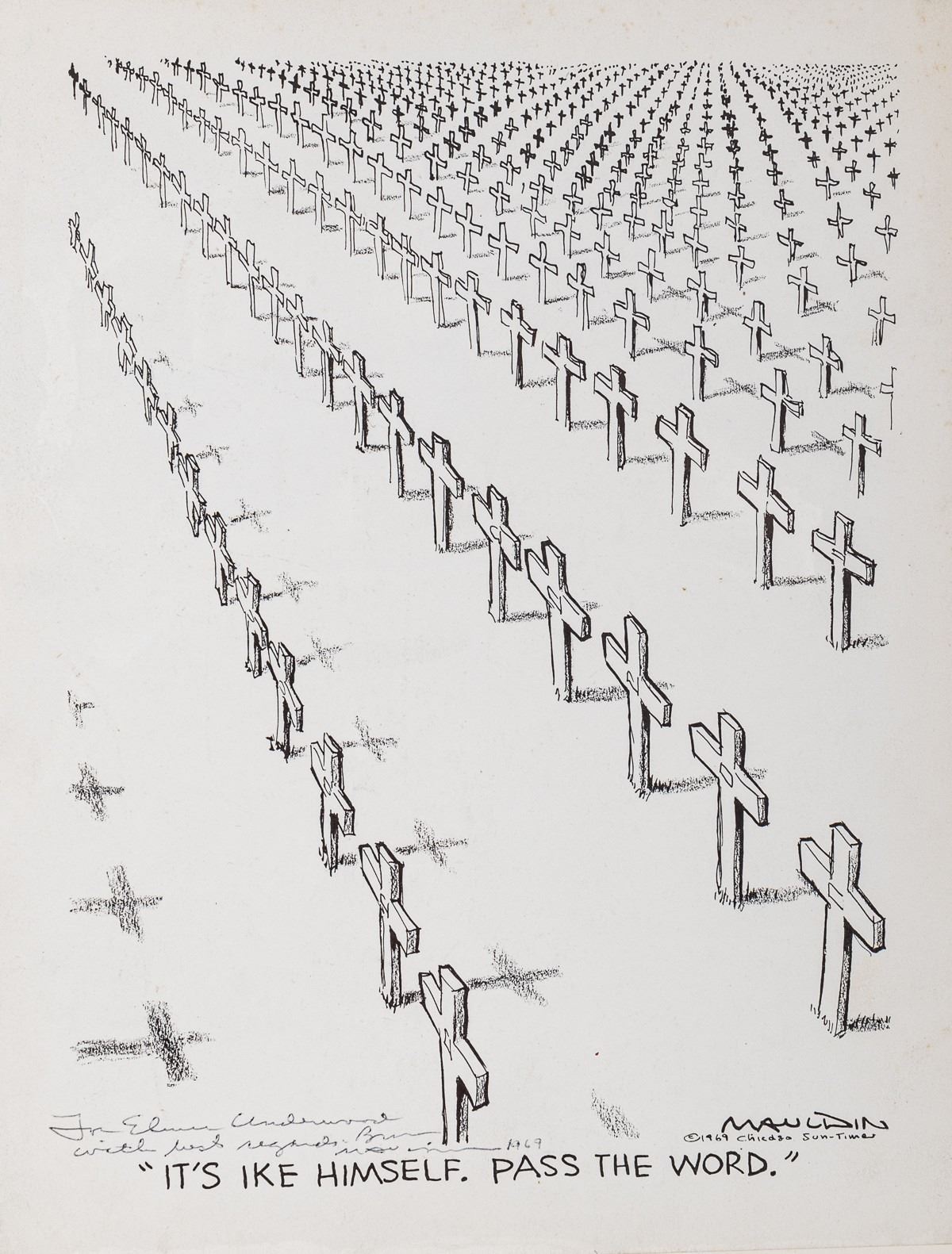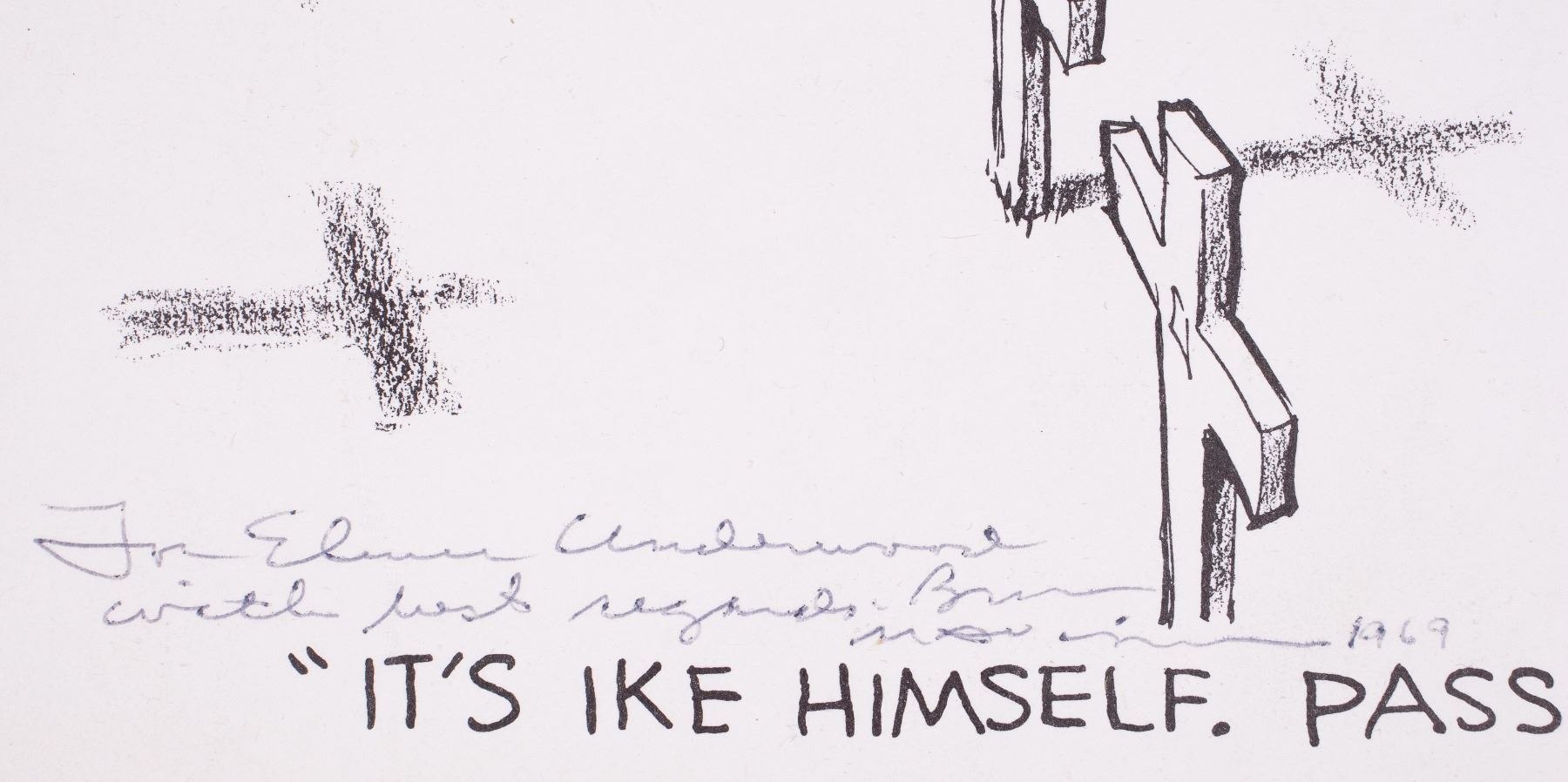 Large artwork by Bill Mauldin, 'It's Ike himself. Pass the word.', 1969. Signed at bottom, 'For [illegible] with best regards, Bill Mauldin - 1969'. Made to memorialize the death of Eisenhower in March 1969. 14 x 11 inches.