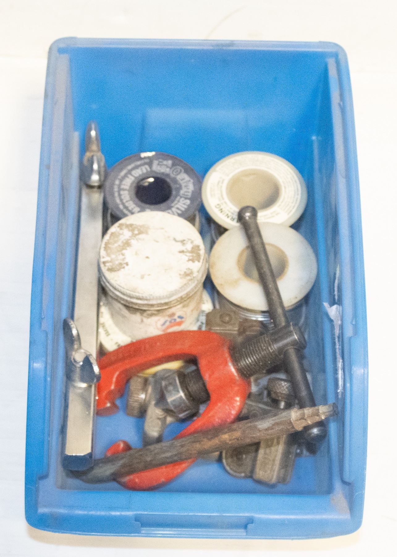 BIN OF PLUMBING SOLDER, TUBE CUTTERS, FLARE TOOL