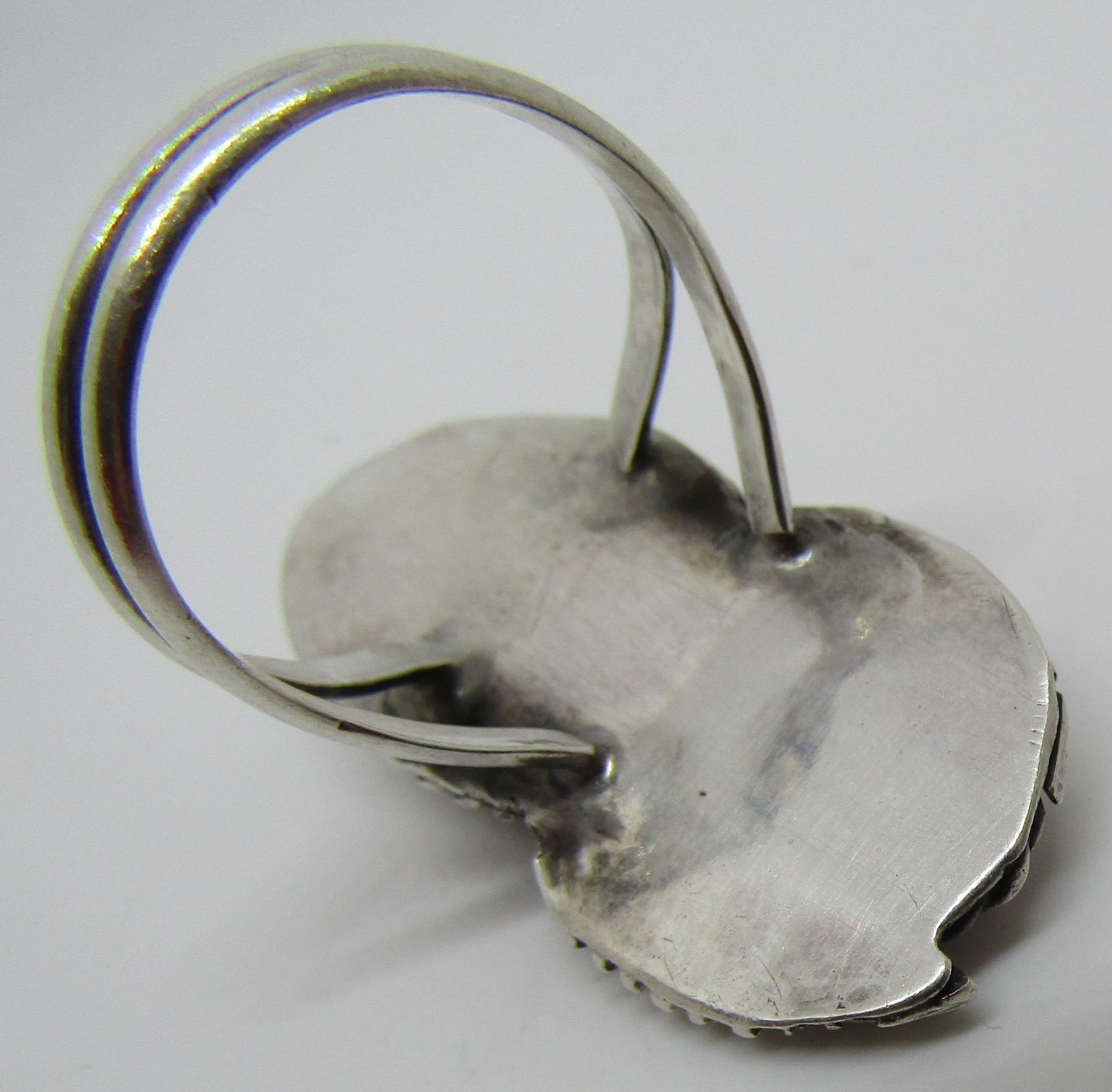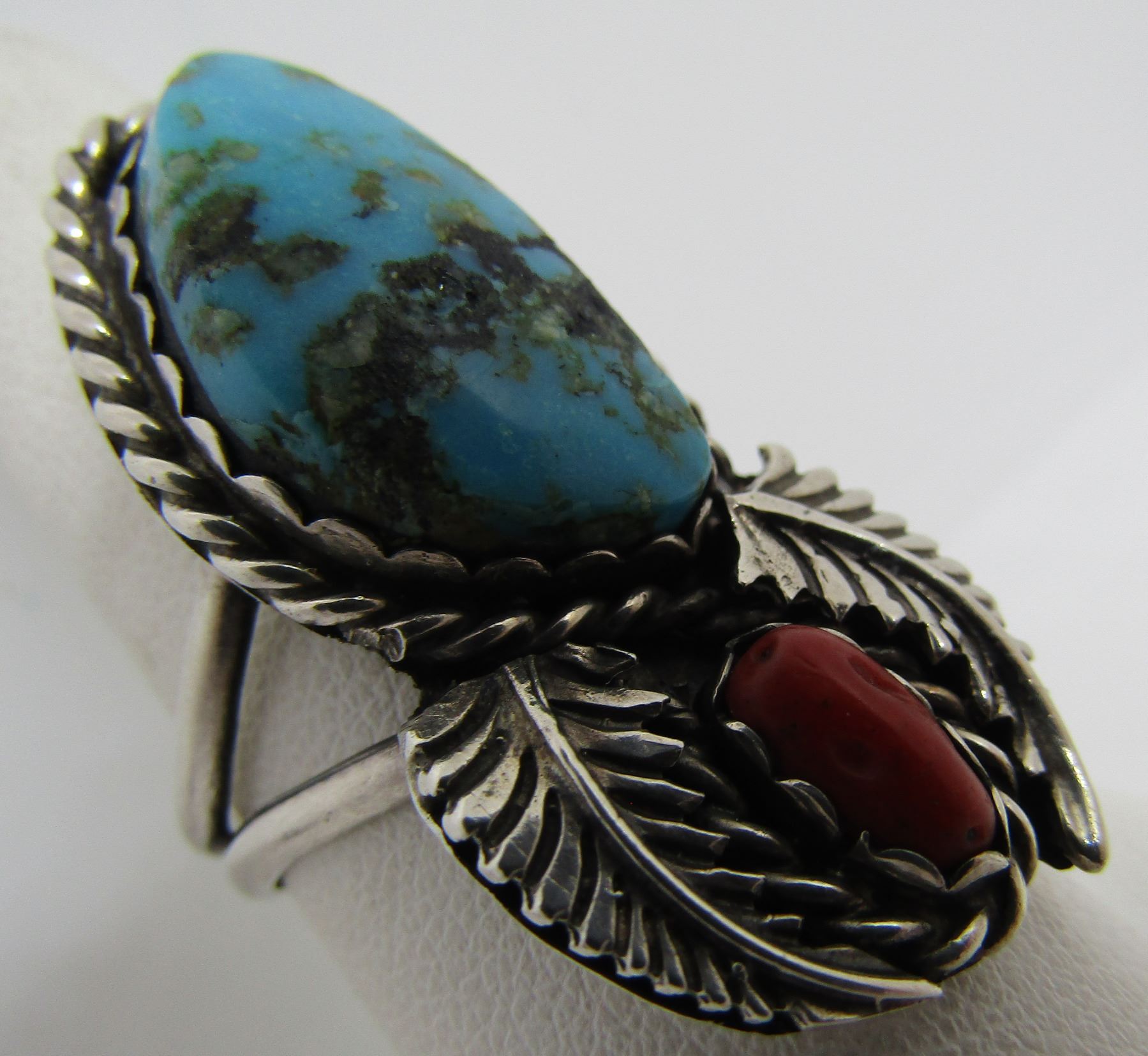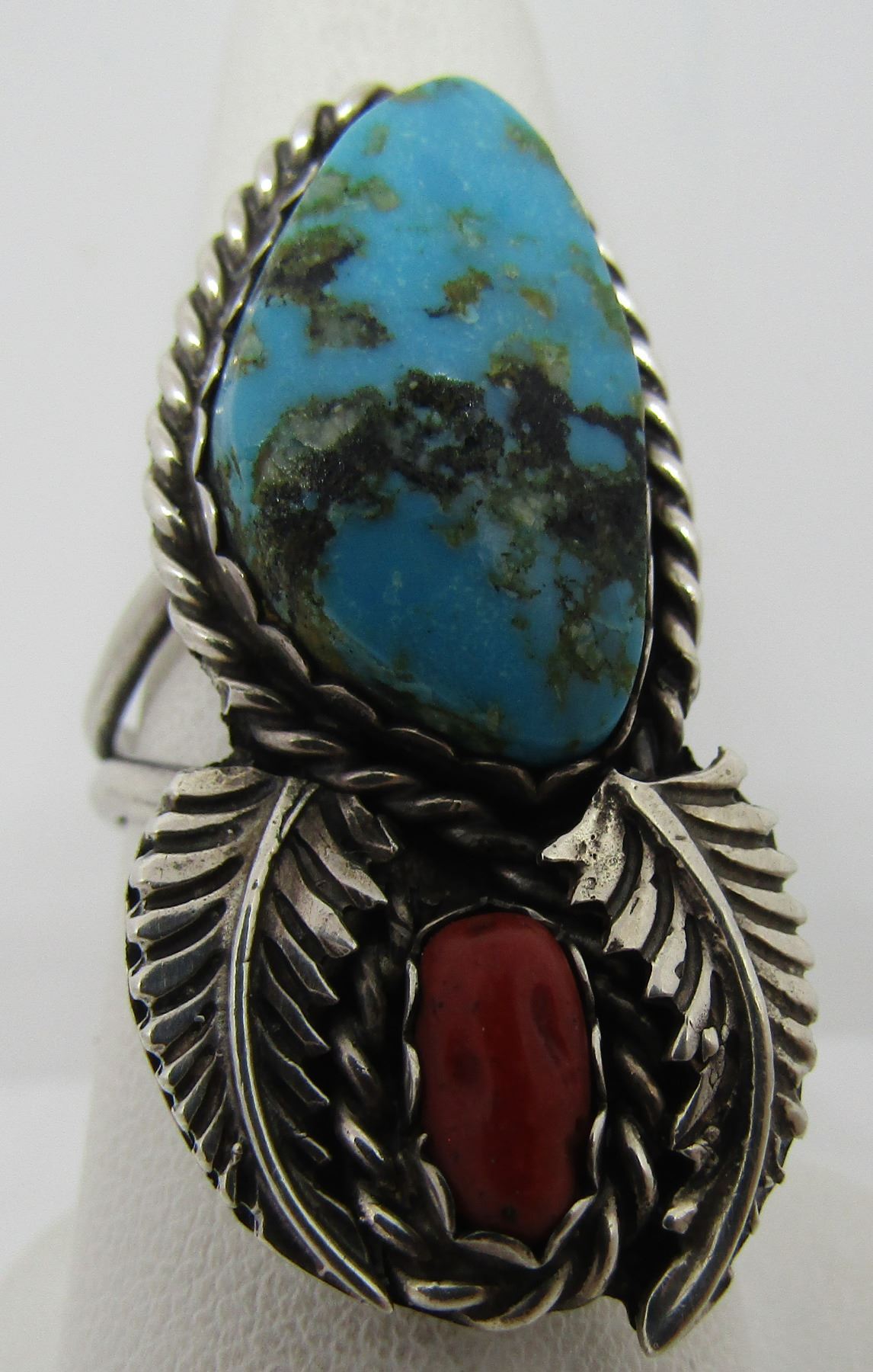 SQUASH BLOSSOM DESIGN UNMARKED TESTED STERLING SILVER. VINTAGE ESTATE NATIVE AMERICAN SOUTHWEST INDIAN JEWELRY. BEZEL MOUNTED WITH 1 CORAL AND 1 TURQUOISE STONE. TOP MEASURES 18MM WIDE BY 38MM LONG..WEIGHS 8.9 GRAMS. SIZE 8.5. USA SHIPPING $5.