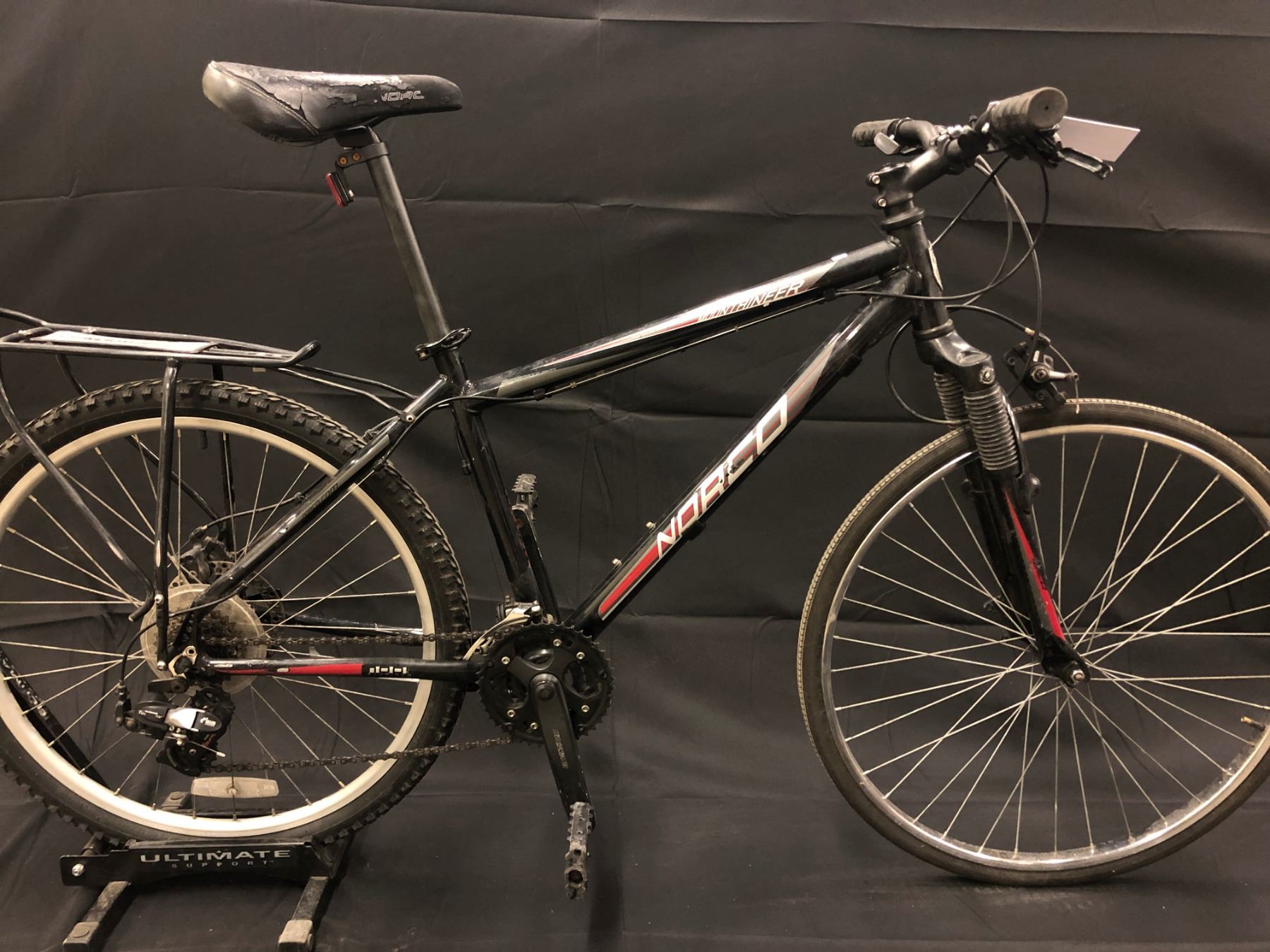 BLACK NORCO MOUNTAINEER 21 SPEED FRONT SUSPENSION MOUNTAIN BIKE (NO FRONT BRAKE)