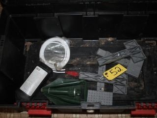 BLACK PLASTIC TOTE, SHOVEL, CORD, CLAMPS