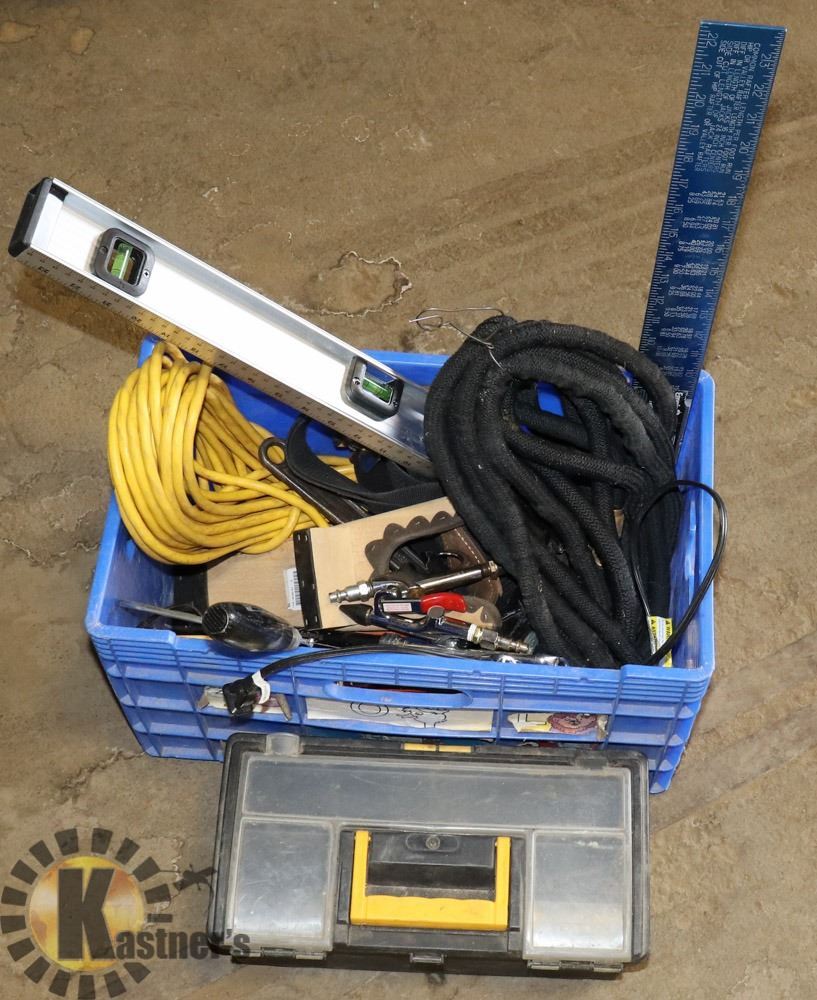 BLUE CRATE FILLED W/TOOLS AND MORE...