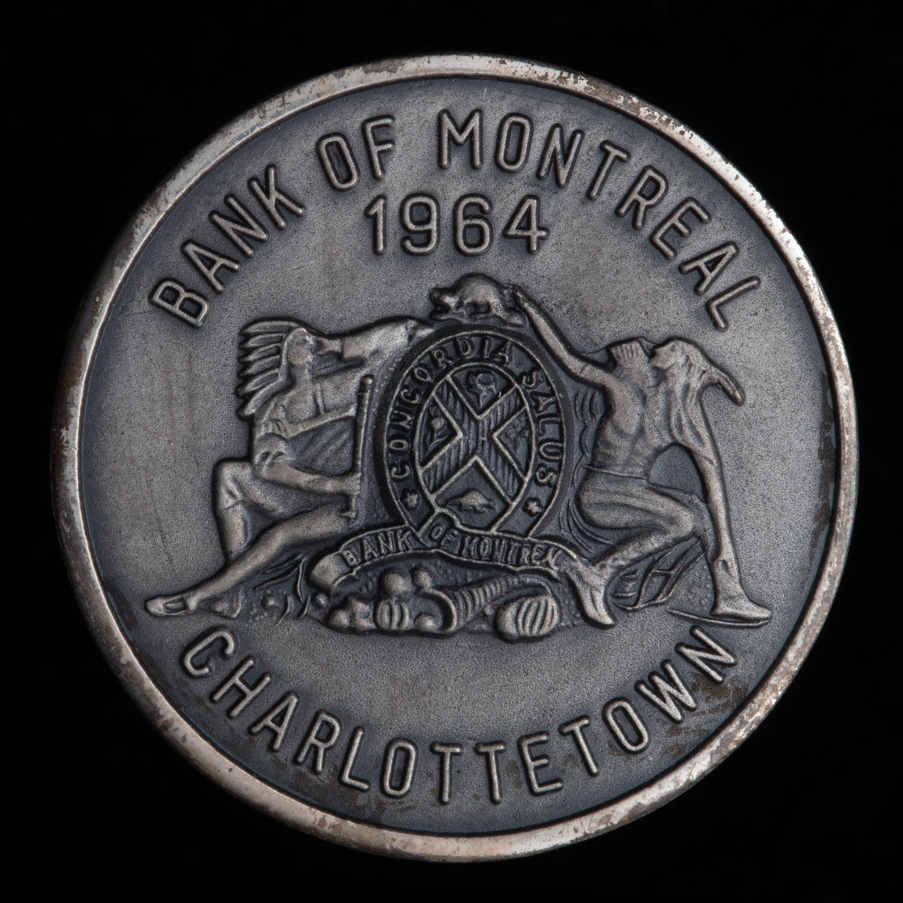 A 36mm, 18.7 gram medal in matte-finished Sterling Silver, issued to commemorate the 1964 centennial of the "Fathers of Confederation" meeting in Charlottetown, with Bank of Montreal crest on front. The first Silver striking of this medal we have ever seen.