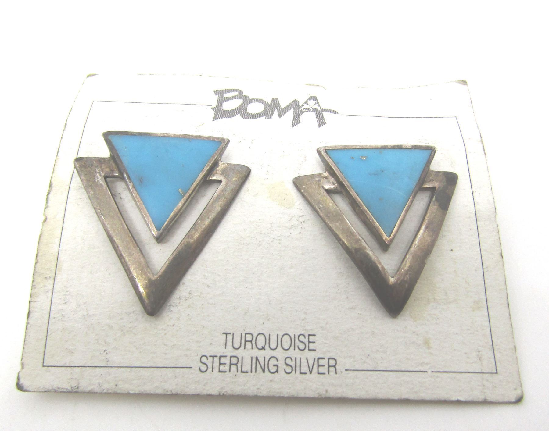 DOUBLE TRIANGLE VINTAGE MODERN DESIGN STERLING SILVER TURQUOISE EARRINGS BY BOMA ARIZONA. PIERCED POST. TESTED & MARKED STERLING SILVER. MEASURES 1" LONG. WEIGHS 6.2 GRAMS. USA SHIPPING $5.