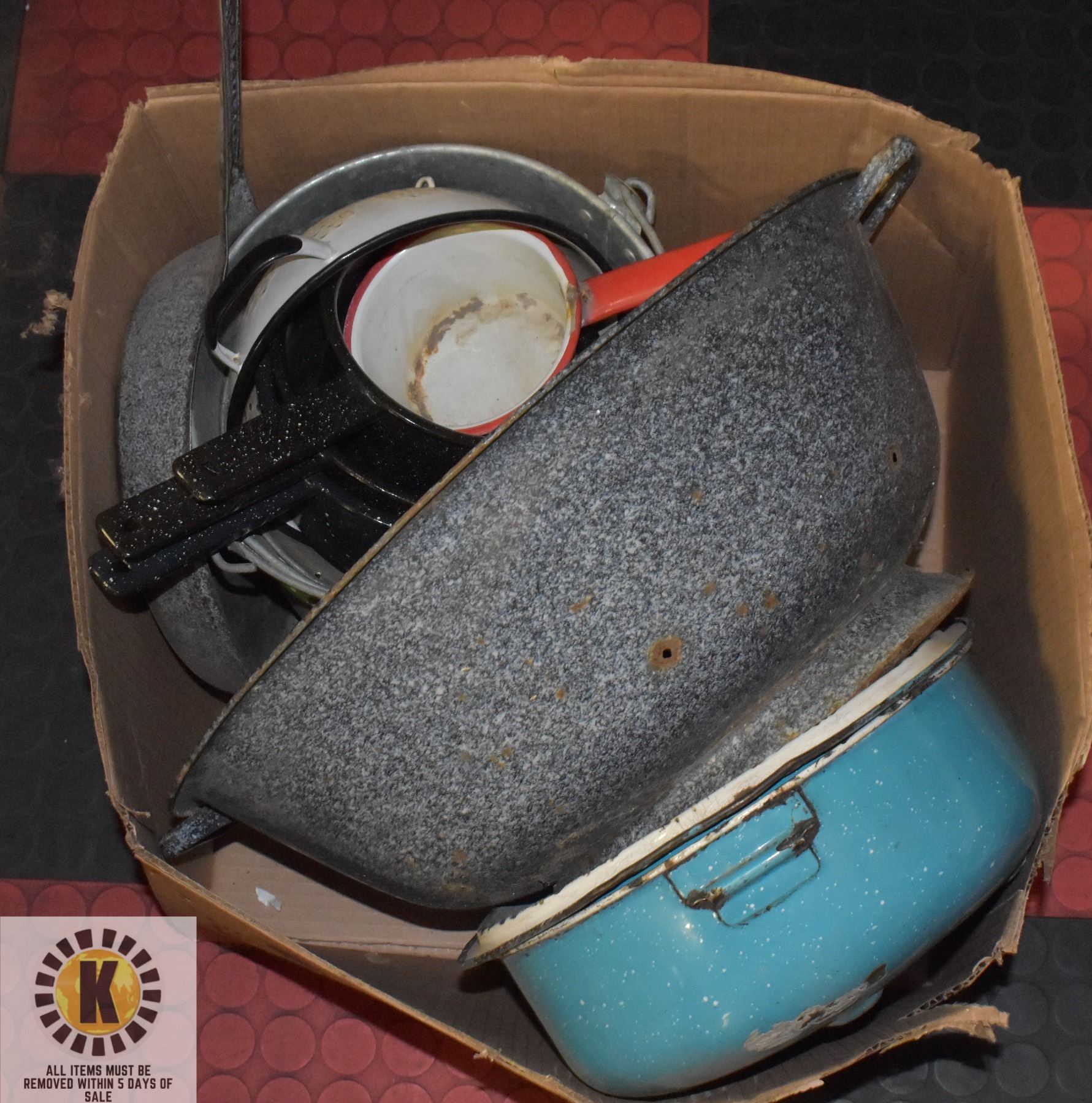 BOX LOT OF GALVANIZED + ENAMEL WARE ITEMS