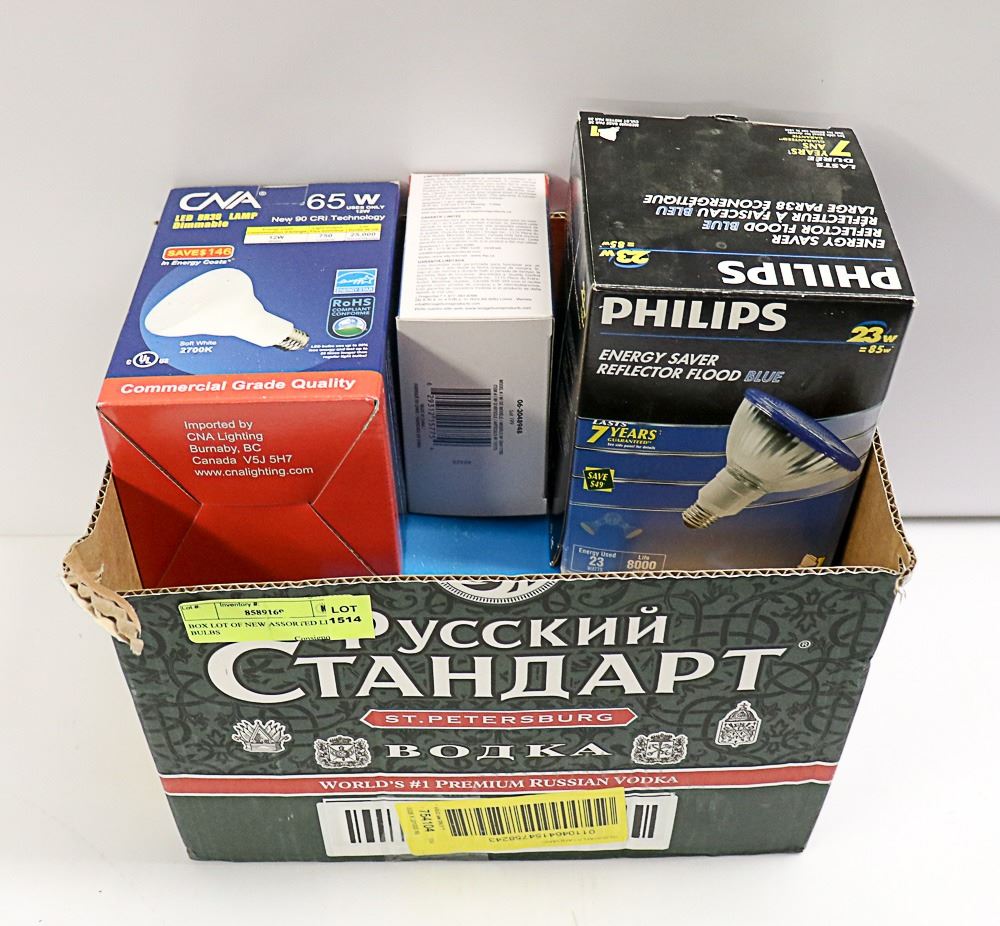 BOX LOT OF NEW ASSORTED LIGHT BULBS