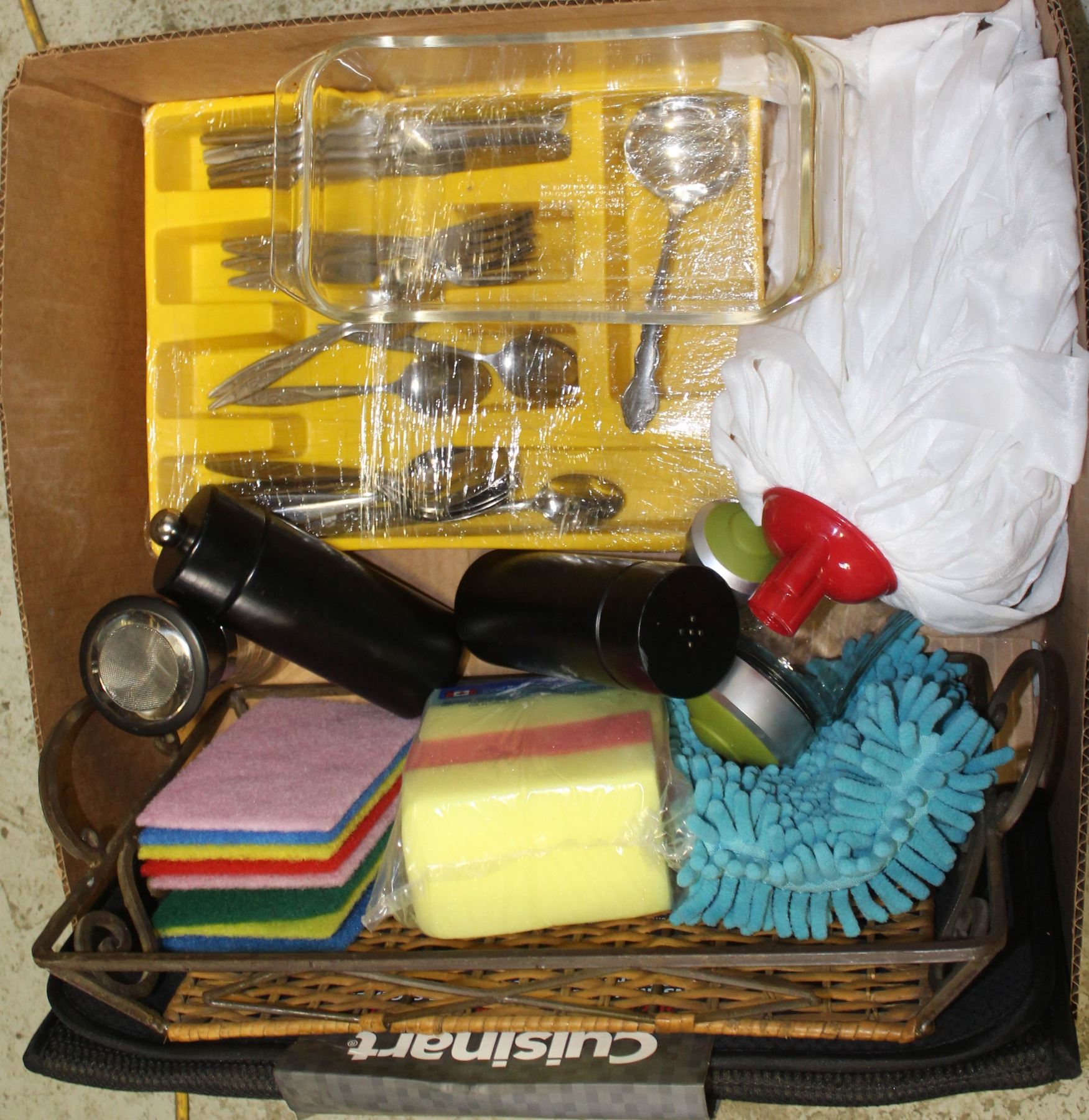SPICE STORAGE & SHAKERS, PYREX BAKEWARE, METAL & WICKER TRAY, CUISINART REVERSIBLE DISH DRYING MATT, NEW MOP HEAD, & MORE