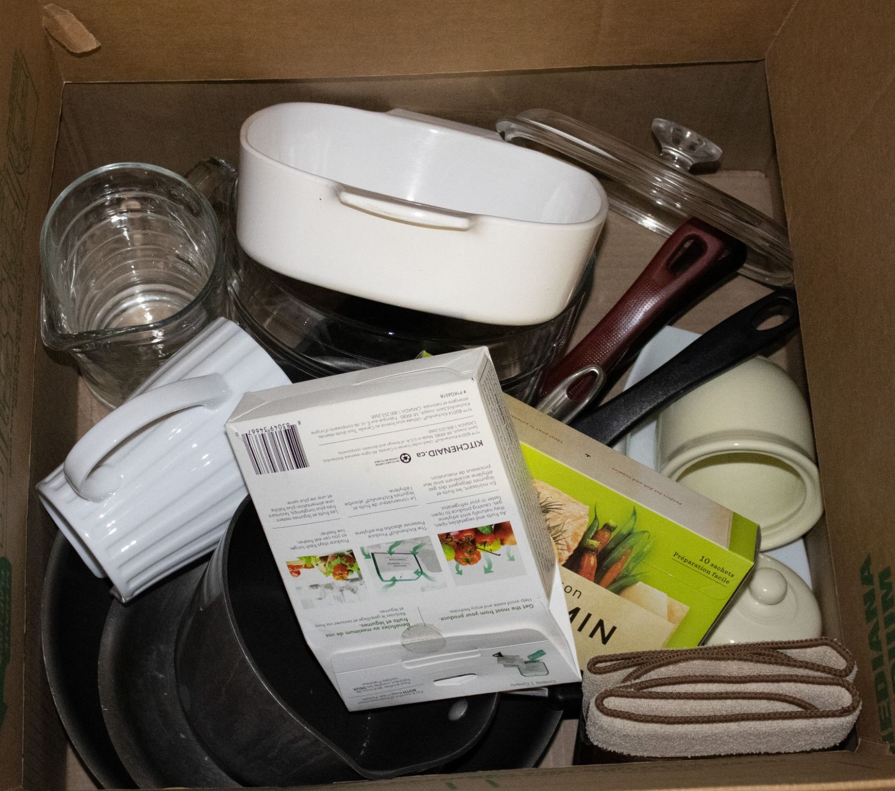 BOX OF ASST. KITCHEN ITEMS INCLUDING FRYING PANS,