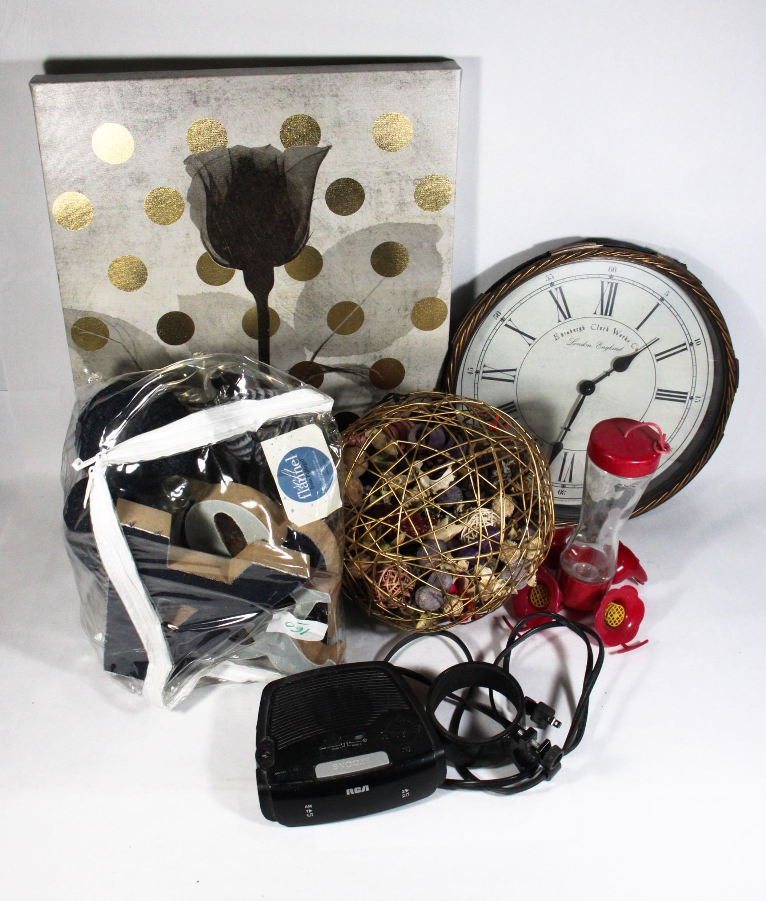 WALL CLOCK, WALL ART, HUMMING BIRD FEEDER, AND MORE