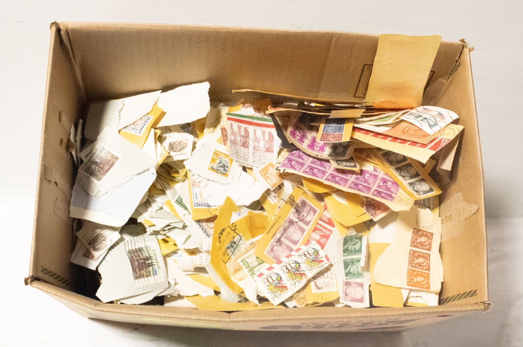 BOX OF OLD CANADIAN AND WORLD STAMPS ON PAPER