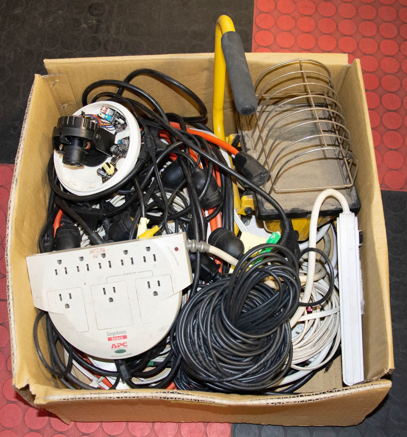 BOX OF POWER BARS, EXTENSION CORDS, WORK LIGHT,