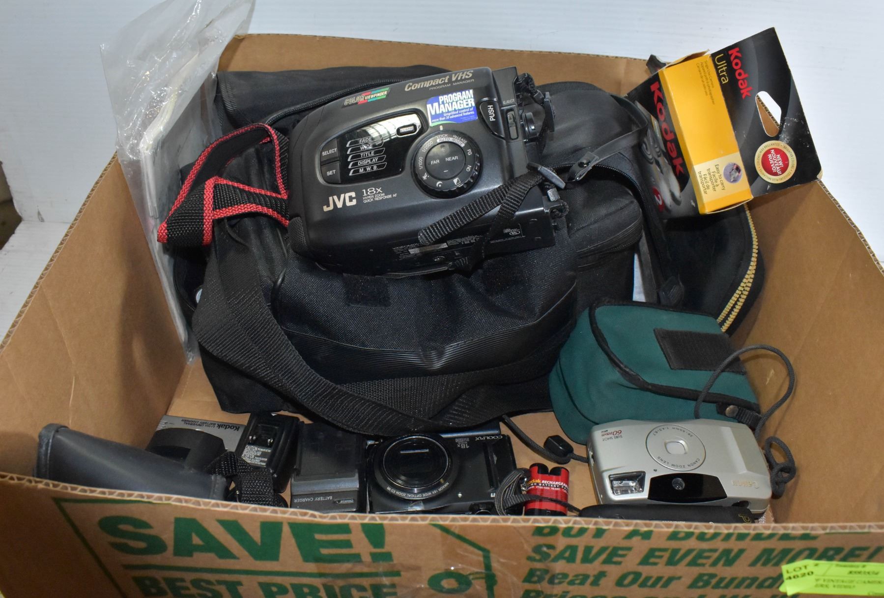 BOX OF VINTAGE CAMERAS, CHARGERS, VIDEO