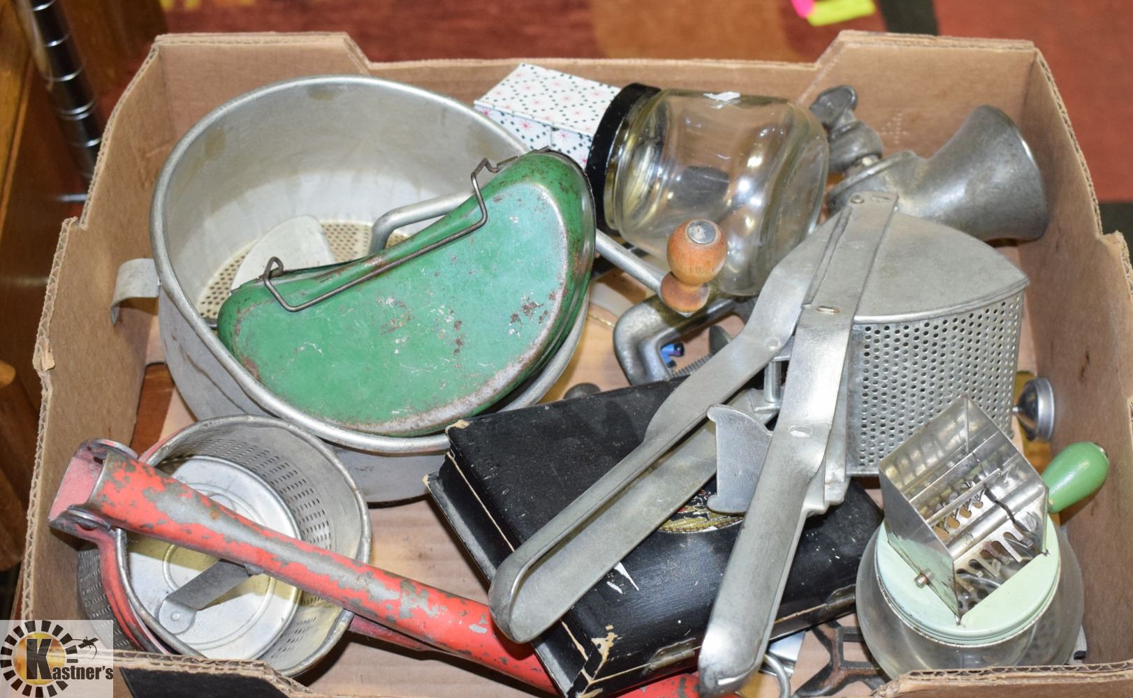 BOX OF VINTAGE GRINDERS AND SIFTERS