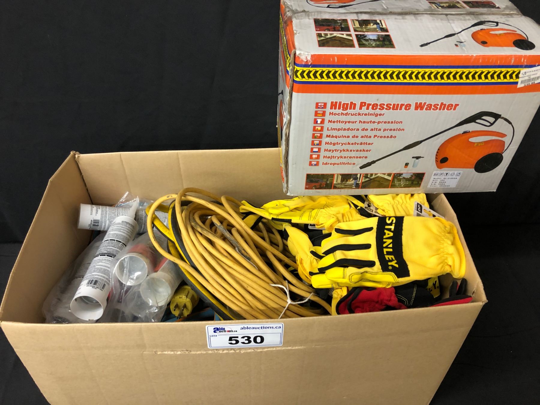 BOX WITH ASSORTED EXTENSION CORDS, SEALANT, WORK GLOVES & ELECTRIC PRESSURE WASHER