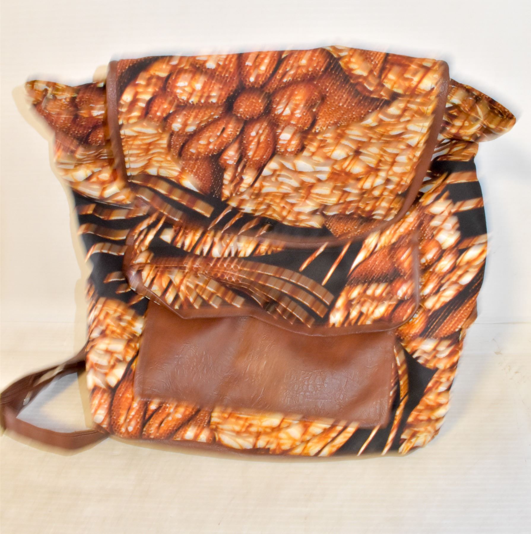 BROWN AND ORANGE FABRIC AND LEATHER BACKPACK