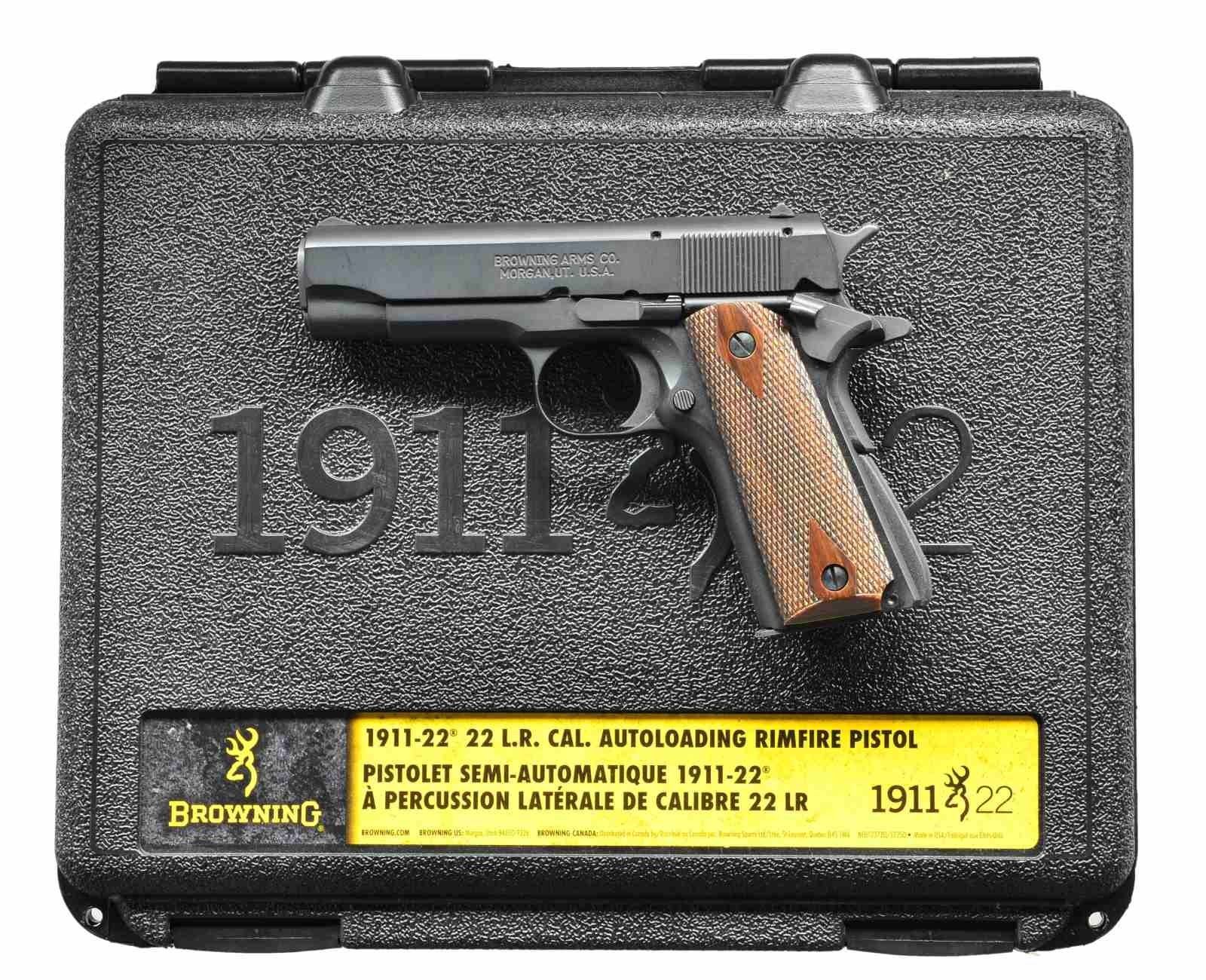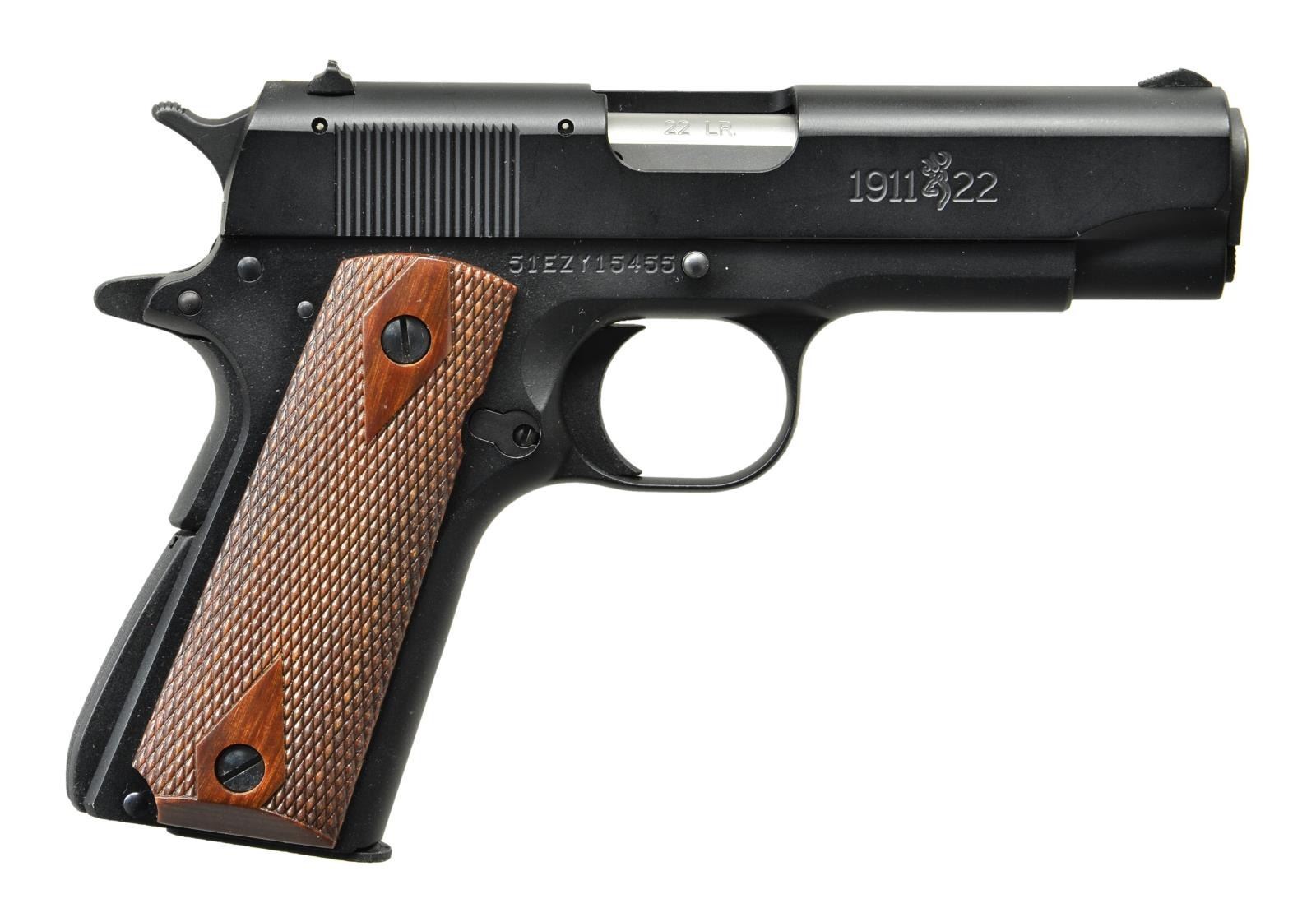 Cal. 22 LR. S# 51EZY15455 (2012). Black matte finished pistol w/ same appearance & controls as Government 1911A1, however in smaller dimensions. 3.625" bbl. w/ fixed sights. 2 Piece checkered walnut grips. MAGS: 1 - 10 rd. UNATTACHED ACCESSORIES: Browning plastic case w/ matching numbered label containing lock, paperwork & fired case. CONDITION: near excellent overall w/ minimal marks & near excellent bore. (22-1763/MD). MODERN. $300-400.