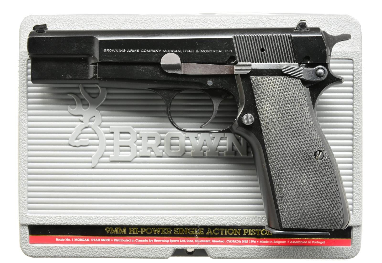 Cal. 9mm Luger. S# 245NY53145. Bbl. 4 5/8". Black epoxy finish. Blade front sight & square notch rear sight w/ white highlights. 2 Piece checkered rubber grips. MAGS: 2 detachable 13 rd. UNATTACHED ACCESSORIES: gray molded box containing owner's manual & friction defense gun oil. CONDITION: over 98% finish showing dents on both sides of frame around trigger pin, mag. disconnect is removed. Bright near excellent bore. (21-1153/DS). MODERN. $500-800.