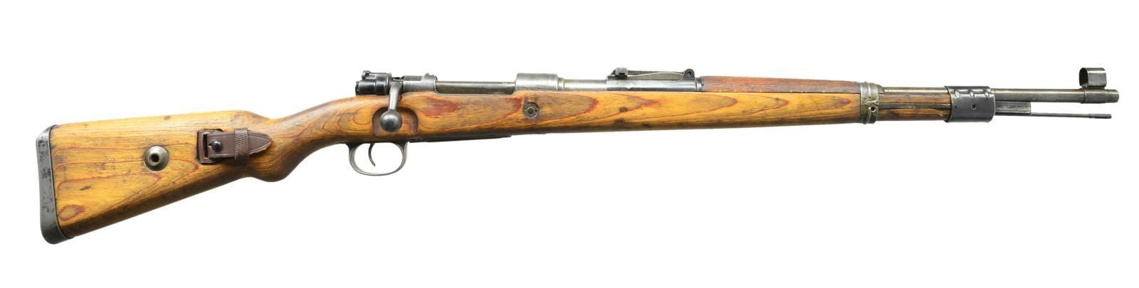 Cal. 8mm. S# 6592H. Bbl. 24" is marked "DOT 13", crest & "L" number at rear. Standard configuration Model 98 action is stamped "MOD98" & DOU45" on rear receiver ring. Left side of action is marked w/ CZ info. Bolt does match. Unmarked laminated stock is fitted w/ pressed steel trigger guard marked "SVW" & floorplate marked "byf". CONDITION: good as partially refinished. Bbl. & action cleaned to gray w/ scattered overall pitting. There is heat discoloration on sight base. Accessory parts also show cleaning. Stock w/ old refinish has numerous marks. Bright shiny bore. Mechanically good. PROVENANCE: from the estate collections of Charles P. Obremski. (22-1348/MGM). CURIO. $300-500.