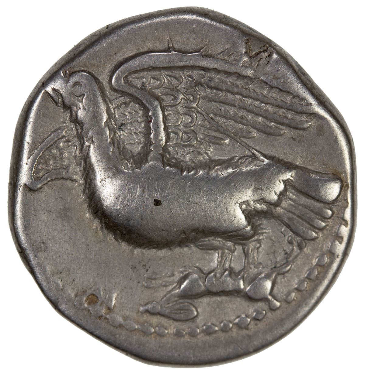 BRUTTIUM: Anonymous, ca. 350-300 BC, AR nomos (7.55g), Kroton, ANS-369, eagle standing left on a hare, with head raised and wings displayed; to lower left, AI monogram // KPO at right, tripod with legs ending in lion's feet; to right, heron standing left, Fine.