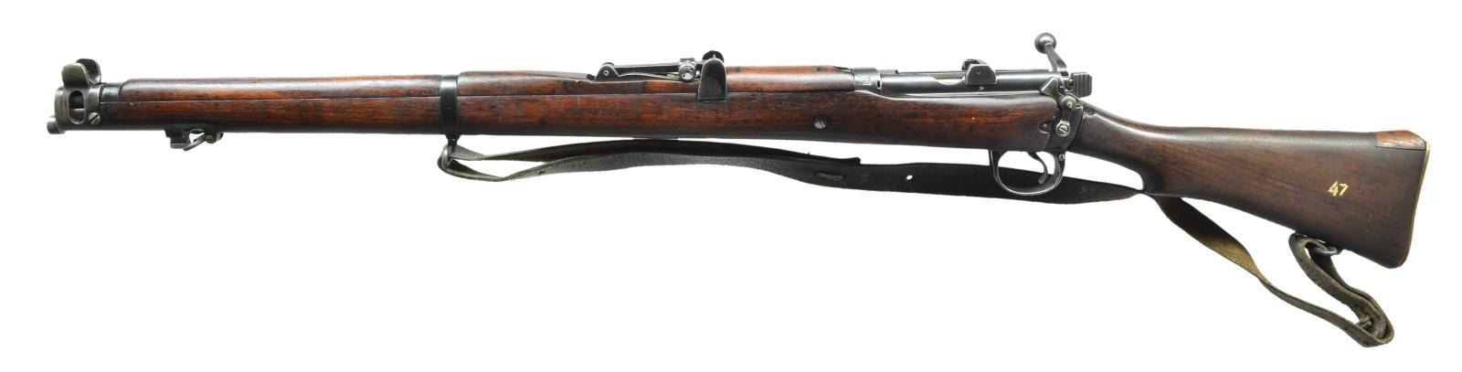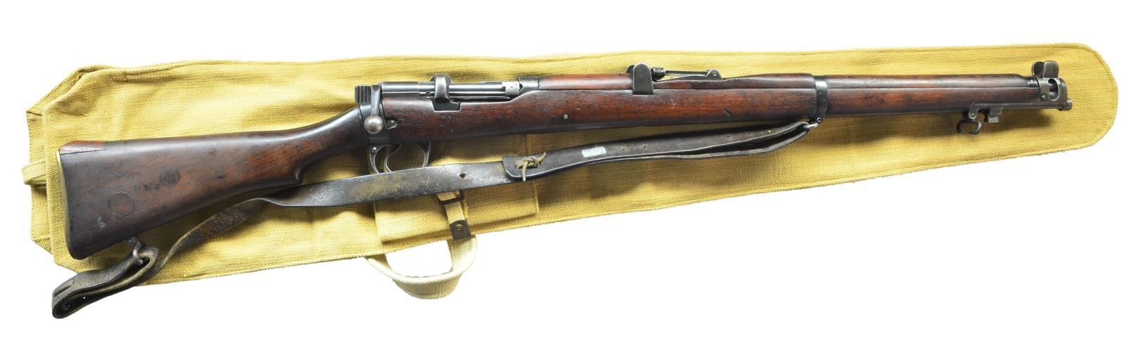 Cal. 410 Ga. S# 10382. Bbl. 25 1/2" rechambered for modern shotgun ammo rather than 410 based on brass 303 case. Mfg. 1913 by BSA & later converted to single shot for riot control in Ishapore. MAGS: NONE; filler block retained by 2 wood pins plus metal loading platform. Matching numbered bolt, nose cap w/ stacking swivel, forend (extremely faint) & rear sight (prior number crossed out); buttstock w/ white "47" on left side plus unreadable marks on right. Brass buttplate & portion of military sling retained by rawhide knot. UNATTACHED ACCESSORIES: near excellent tan colored canvas carry bag having unused appearance. CONDITION: good overall appearance w/ normal reinforcement screw in sock just forward of receiver. Buttstock repair at heel & toe plus walnut disk in place of brass disk. Hand wear & faint marks on stock set. Good metal finish w/ typical high point wear. Near excellent bore. PROVENANCE: from the estate collections of Charles P. Obremski. (22-1372/NW). CURIO. $250-400.