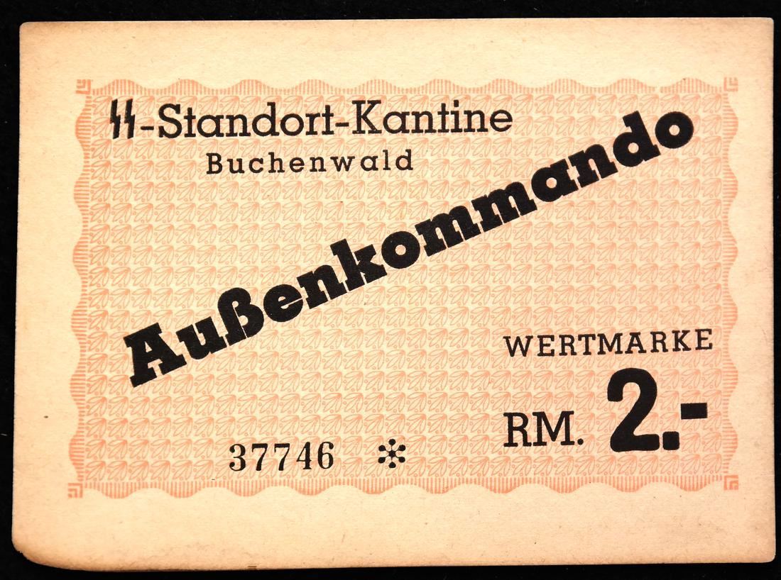 Three different SS-Standort-Kantine - Buchenwald / Wertmarke notes, 1RM, 2RM and 3RM denominations, one SS-Standort-Kantine / Buchenwald / Auenkommando 2RM note, one Rottleberode overprinted 50pf note, and one Schwerte (Ruhr) overprinted 2RM note, mixed condition.