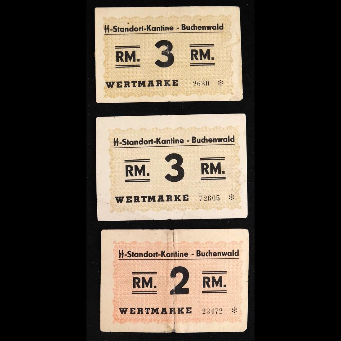 Includes SS-Standort-Kantine - Buchenwald / Wertmarke 1RM (4), 2RM (2), 3RM (2), SS-Standort-Kantine / Buchenwald / Auenkommando 2RM (2), Rottleberode overprinted 50pf (2) and Schwerte (Ruhr) overprinted 2RM (5) notes, mixed condition.
