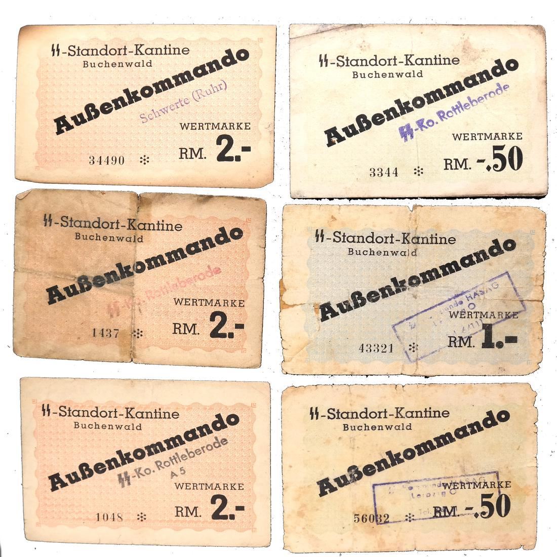 Includes overprinted SS-Standort-Kantine / Buchenwald / Auenkommando notes for HASAG Leipzig O, Schwerte (Ruhr) and Rottleberode, mixed condition.