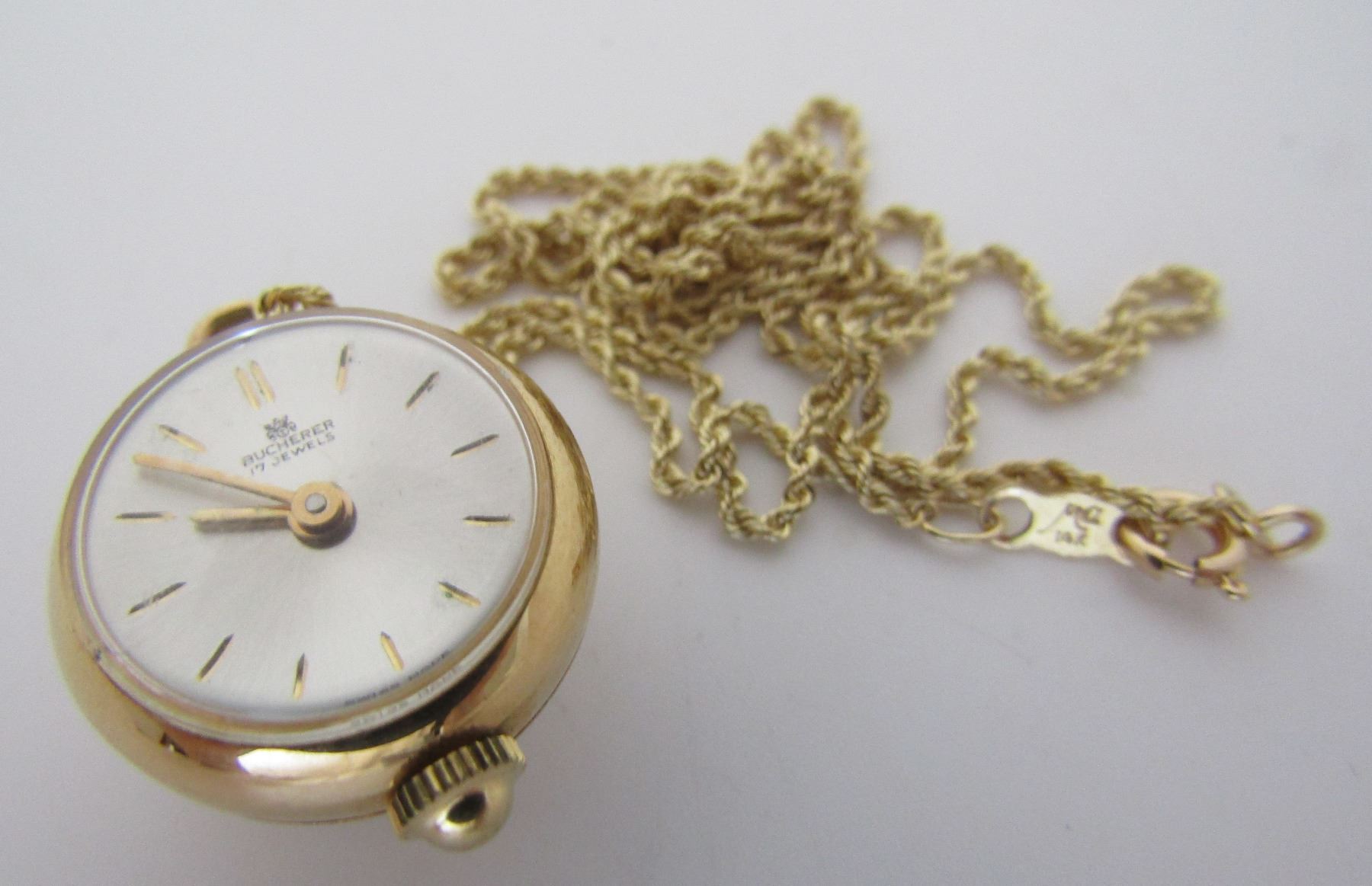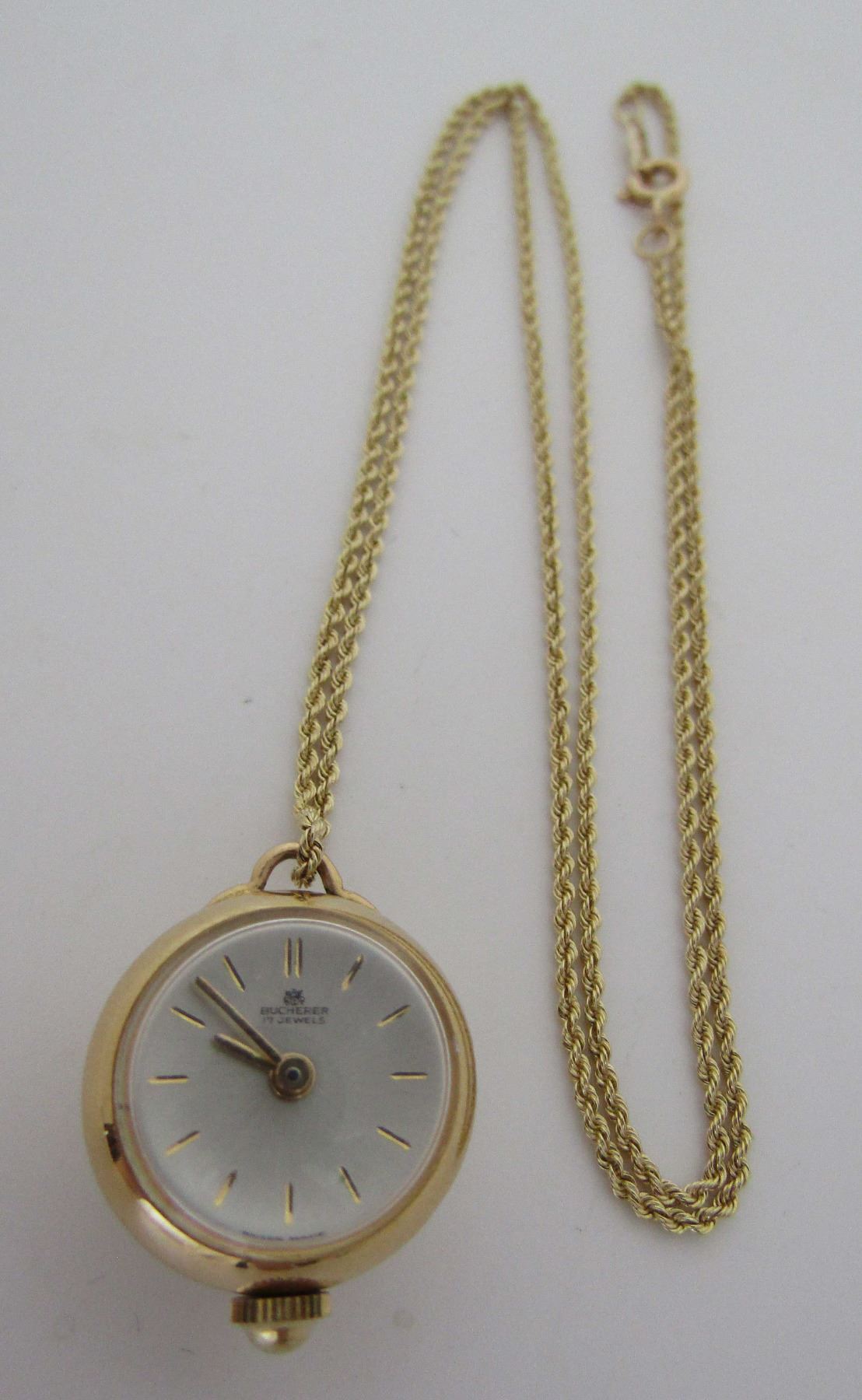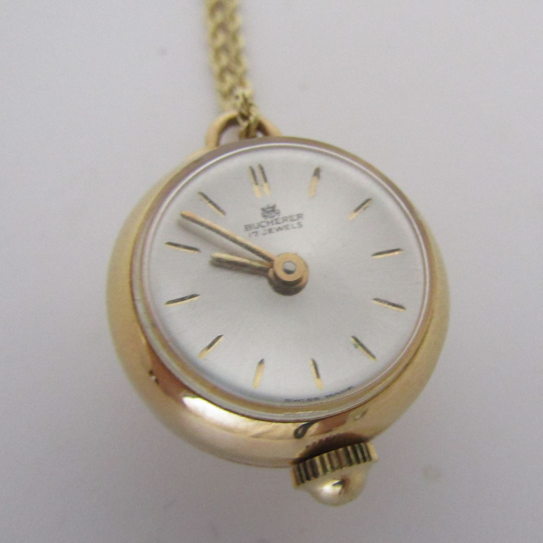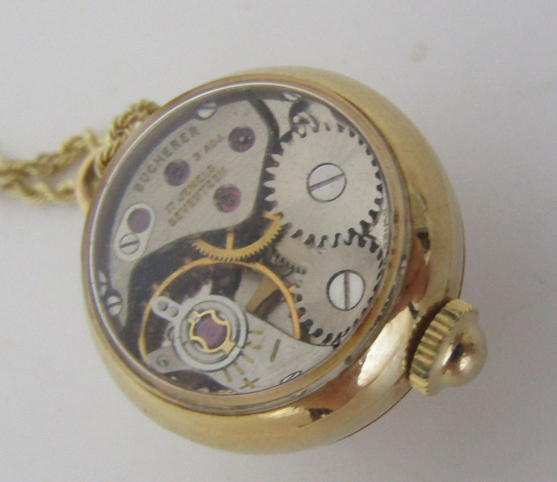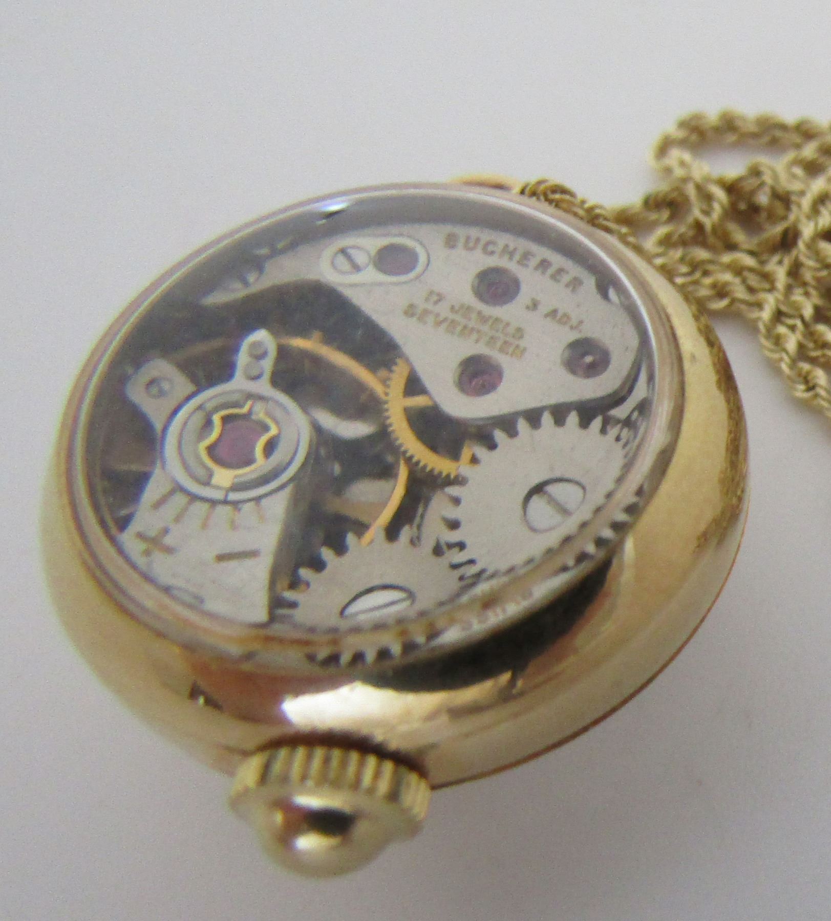 ANTIQUE VINTAGE ESTATE SWISS 17 JEWEL 14K BUCHERER LAVALIER AND 14K 20 INCH LONG CHAIN. MARKED "14K". WATCH 13.5 X 18.5MM. WEIGHS 9.8 GRAMS. RUNNING, NOT SERVICED. USA SHIPPING $5.